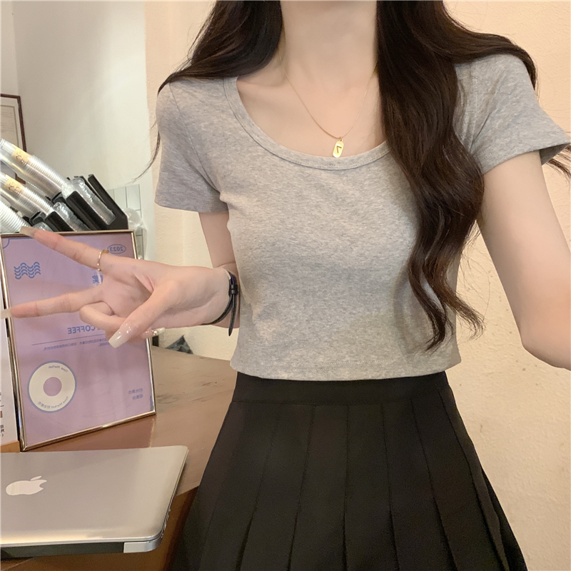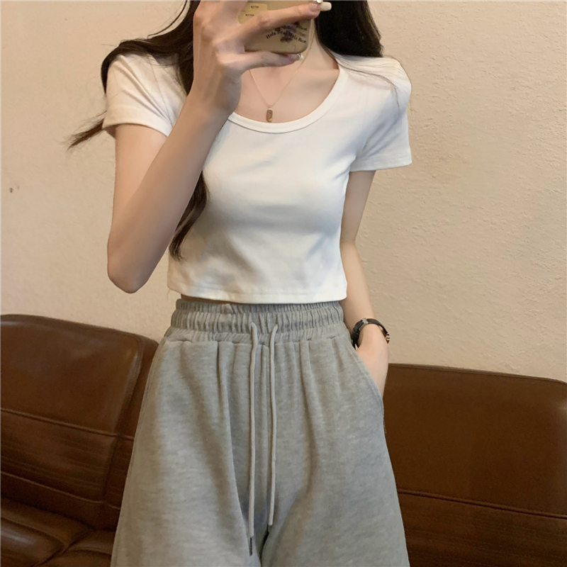 显瘦短款 圆领修身 高腰露脐甜辣小个子上衣 夏季 正肩白色t恤女短袖