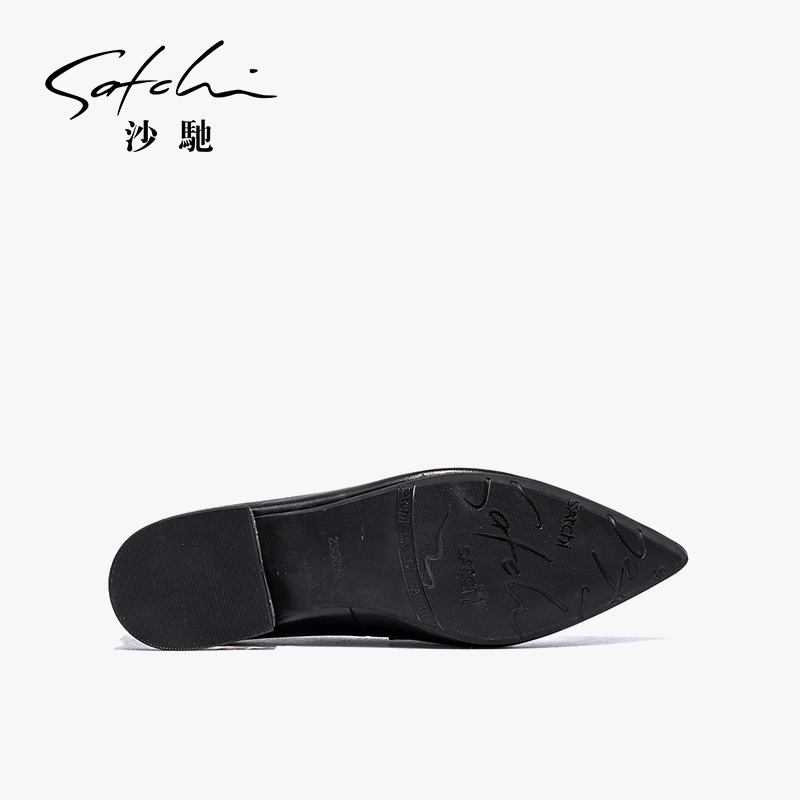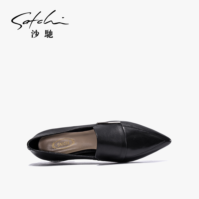 OL单鞋 沙驰女鞋 真皮尖头粗跟水钻懒人一脚蹬通勤工作鞋 新款 女 秋季