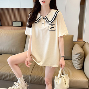 短袖 女装 t恤女夏季 宽松大码 胖mm娃娃领撞色上衣服 韩版 翻领polo衫