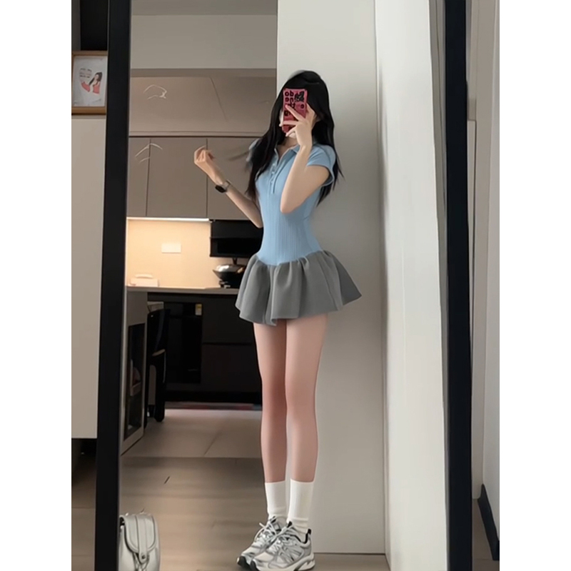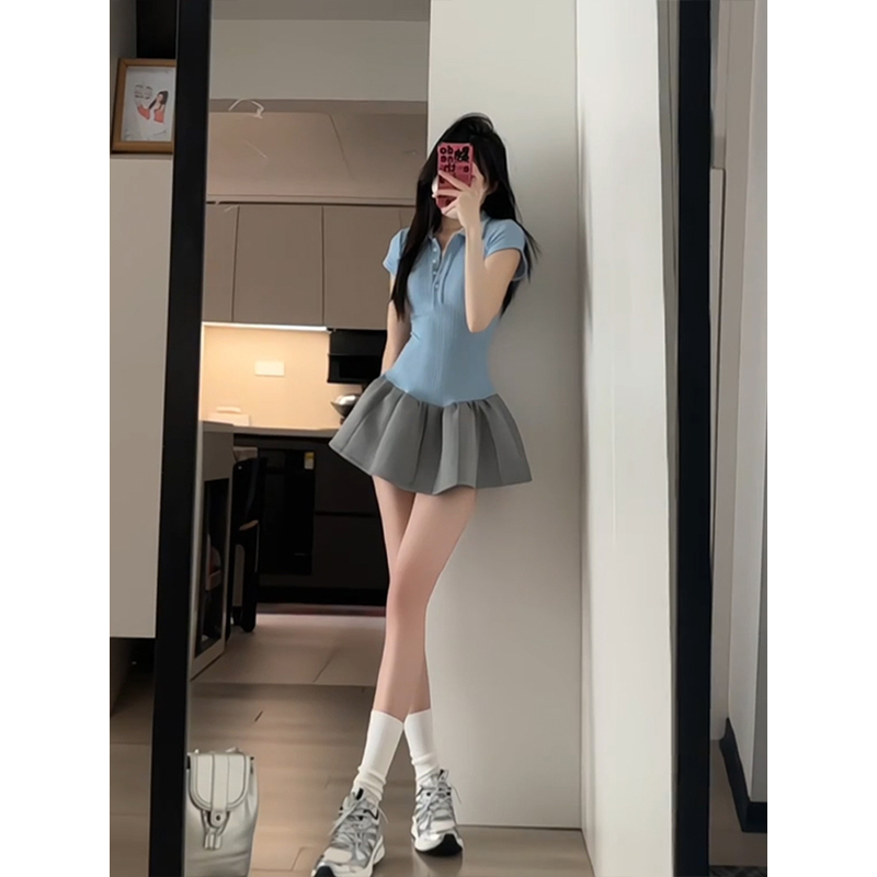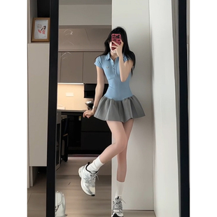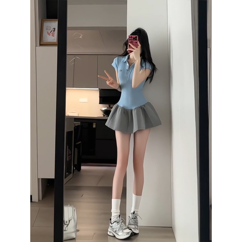 XZY 连衣裙女25年夏甜辣妹收腰短裙 微胖韩系学院风拼接polo领短袖