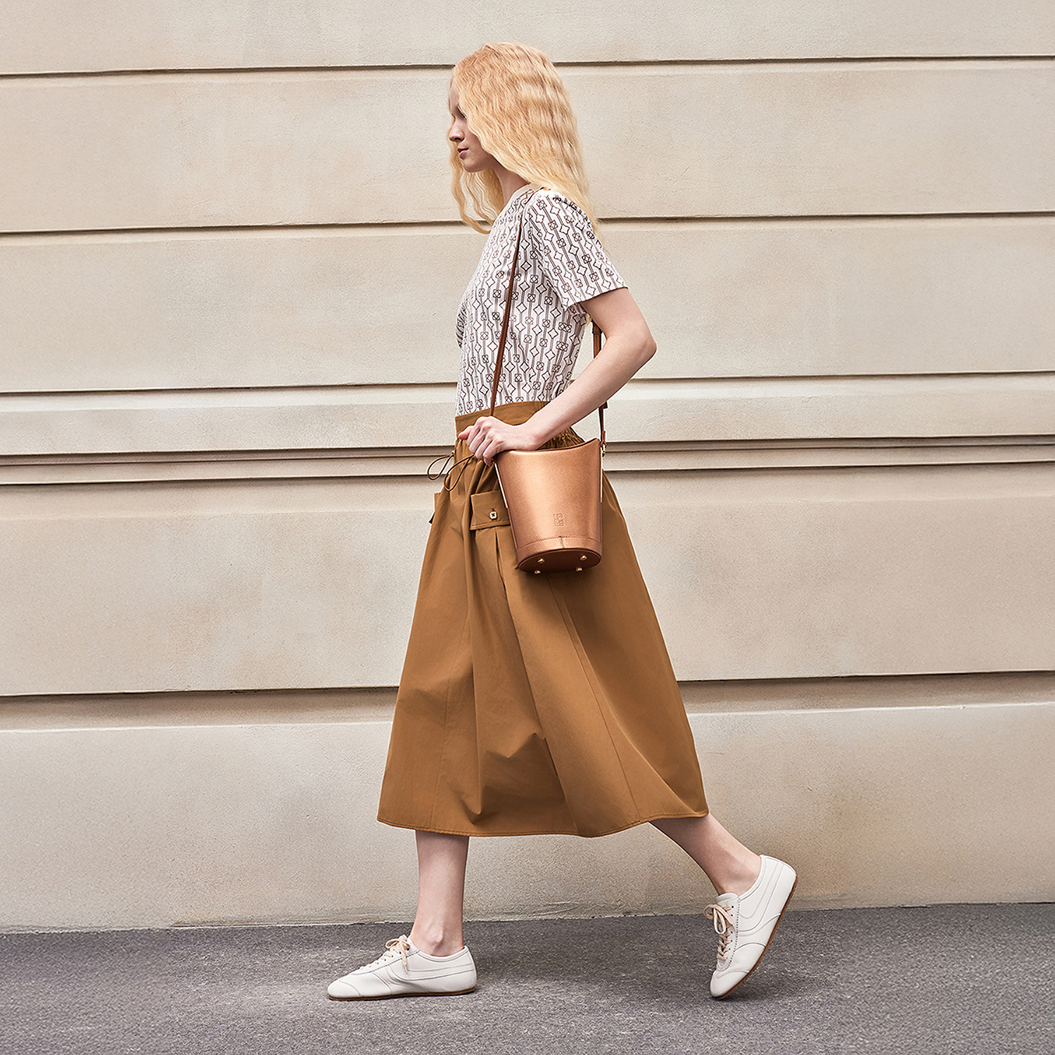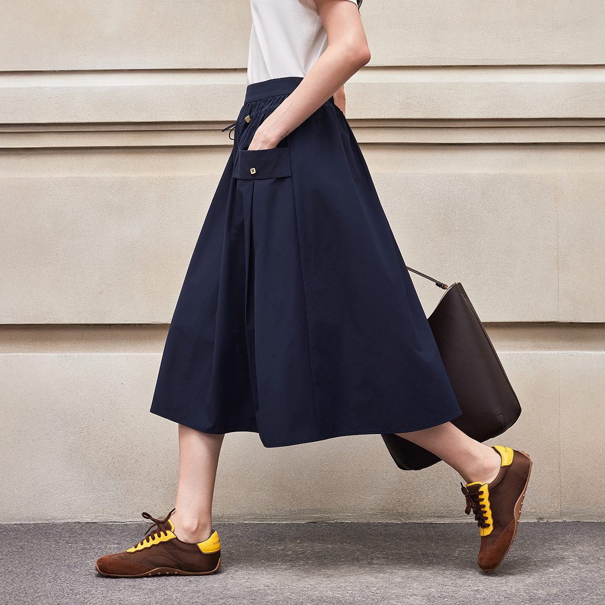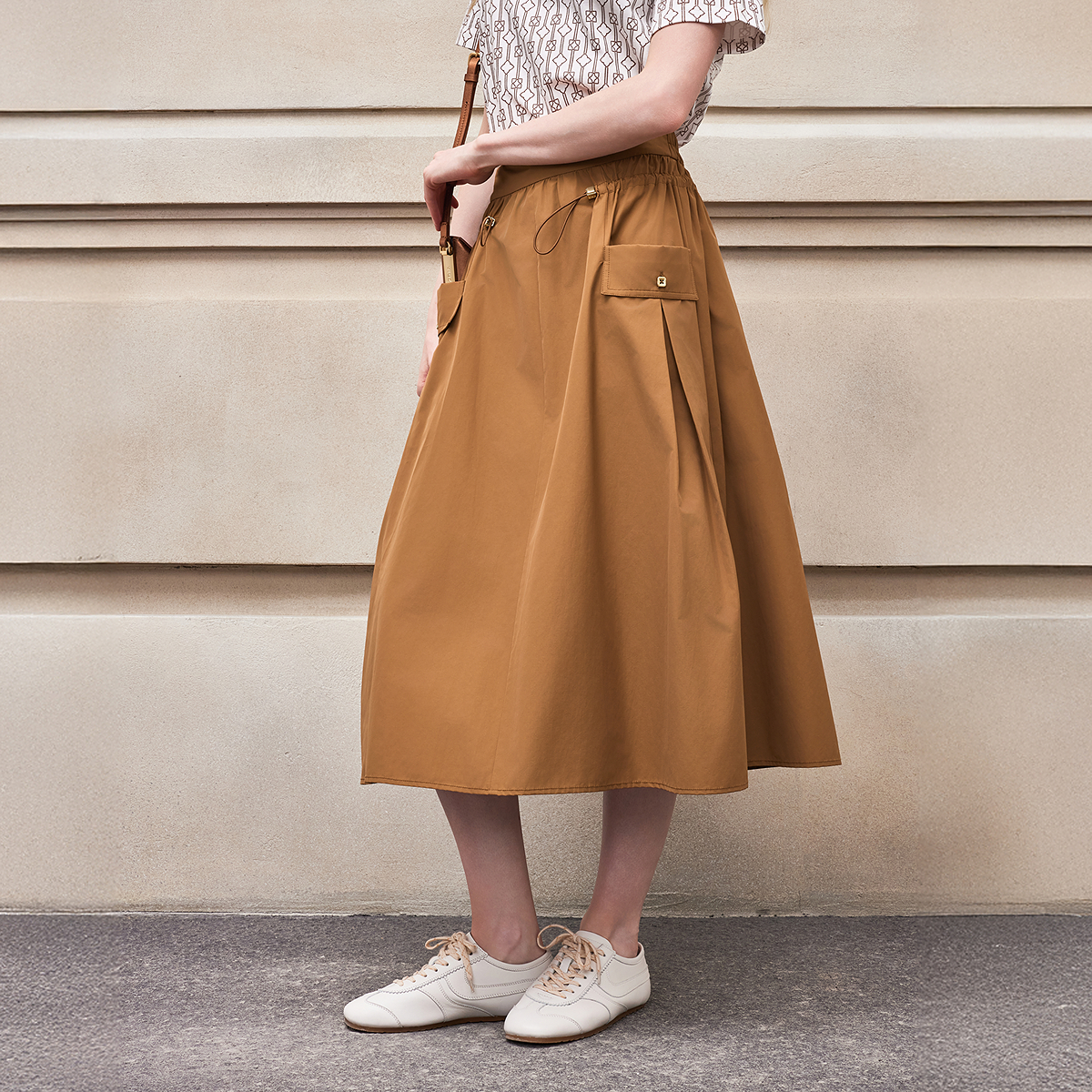 BCBG 时髦气质简约百搭收腰褶饰A字中长半身裙伞裙 2025夏新品