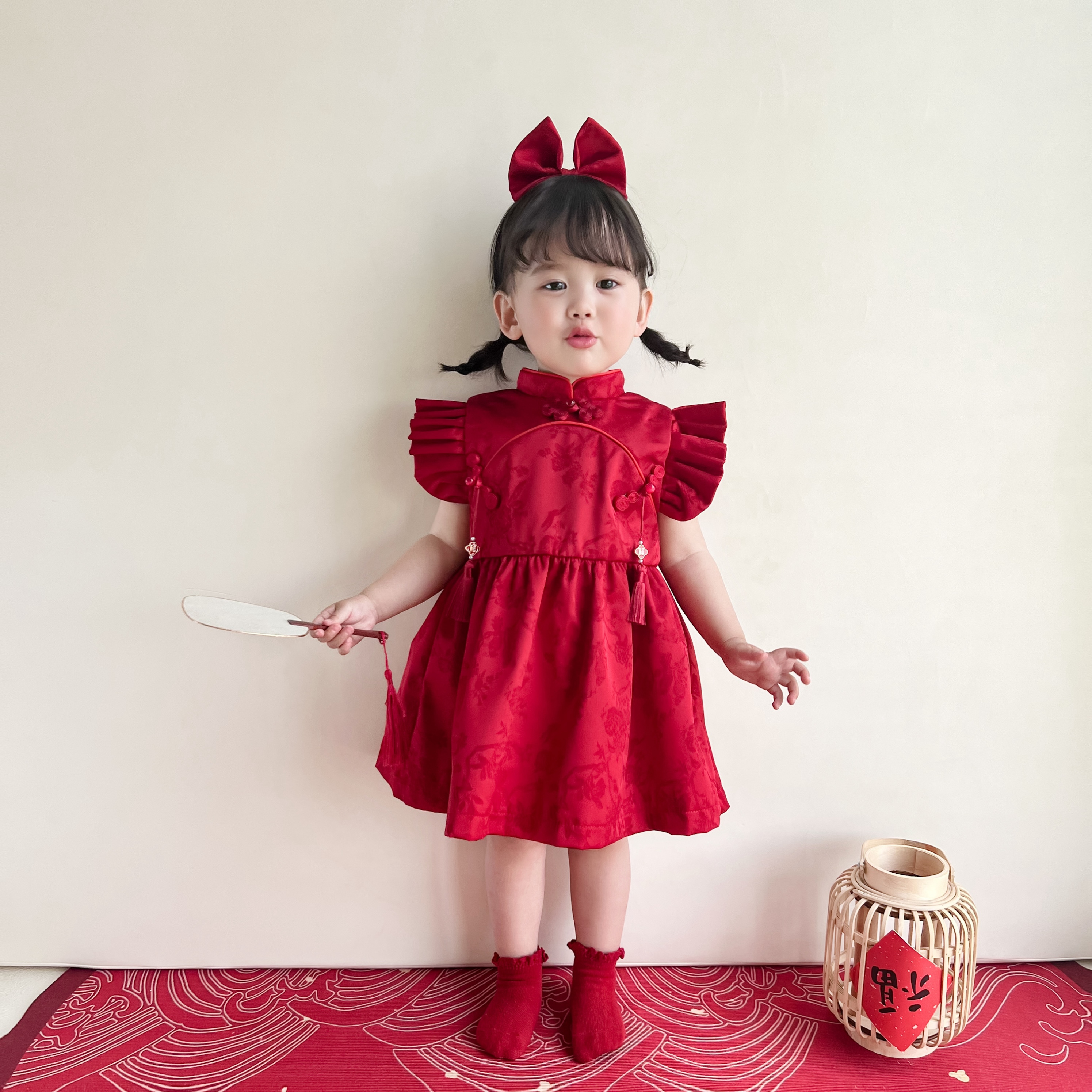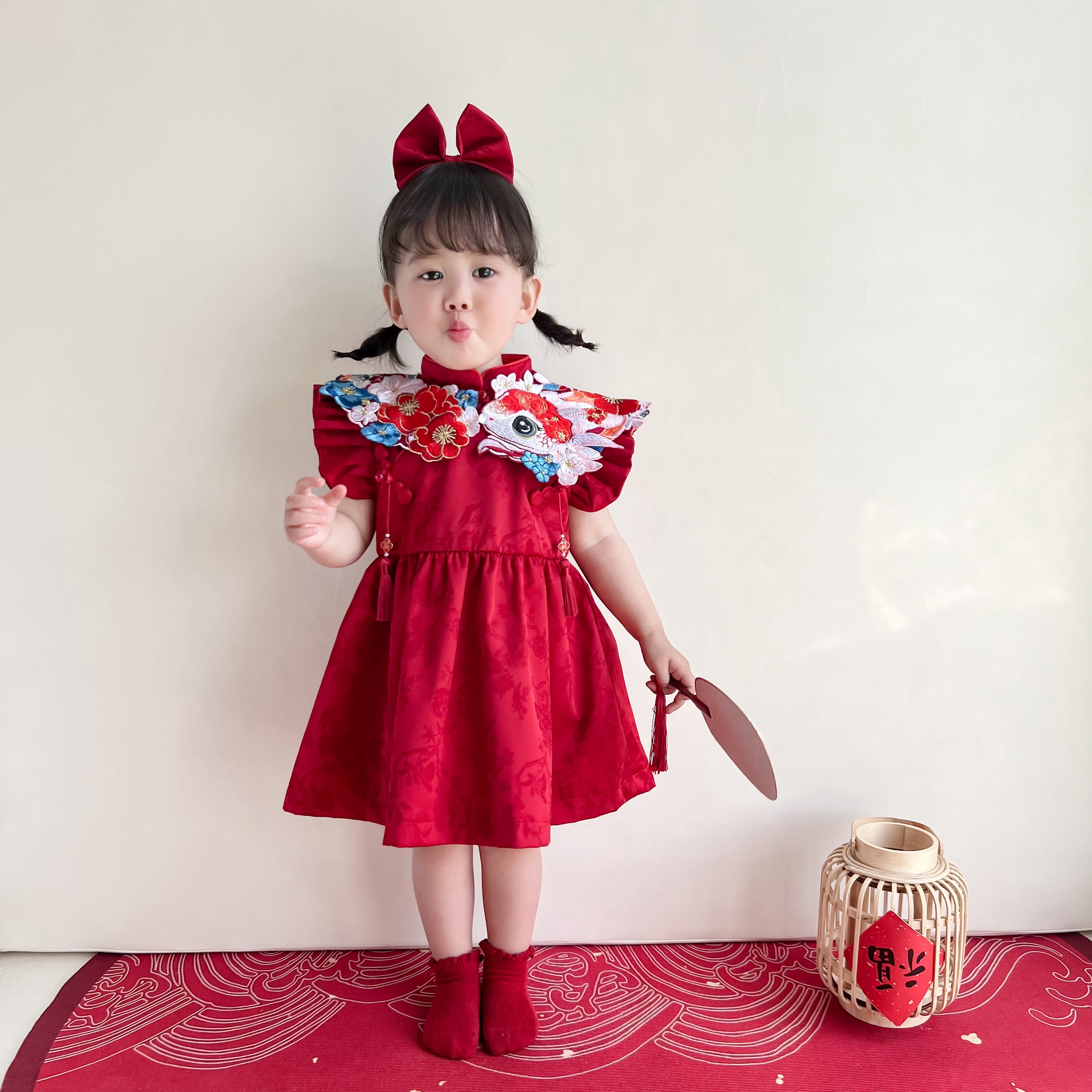唐装 抓周冠衣中式 高端生日宴百天宴公主裙红 款 女宝宝周岁礼服夏季