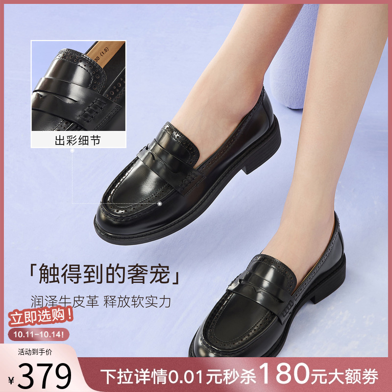 女单鞋 皮鞋 WWE66CA5 牛皮英伦风布洛克乐福鞋 百思图2025秋商场新款
