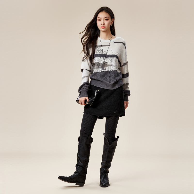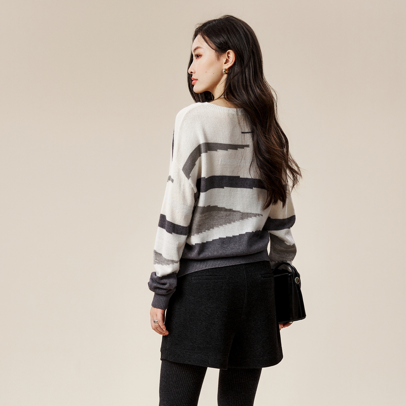 时尚 女装 冬季 宽松绵羊毛套头毛衫 新款 XG雪歌绣花拼色设计毛针织衫