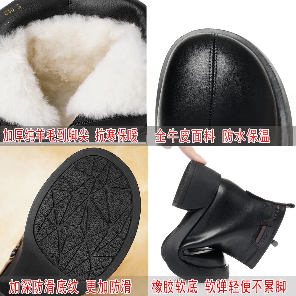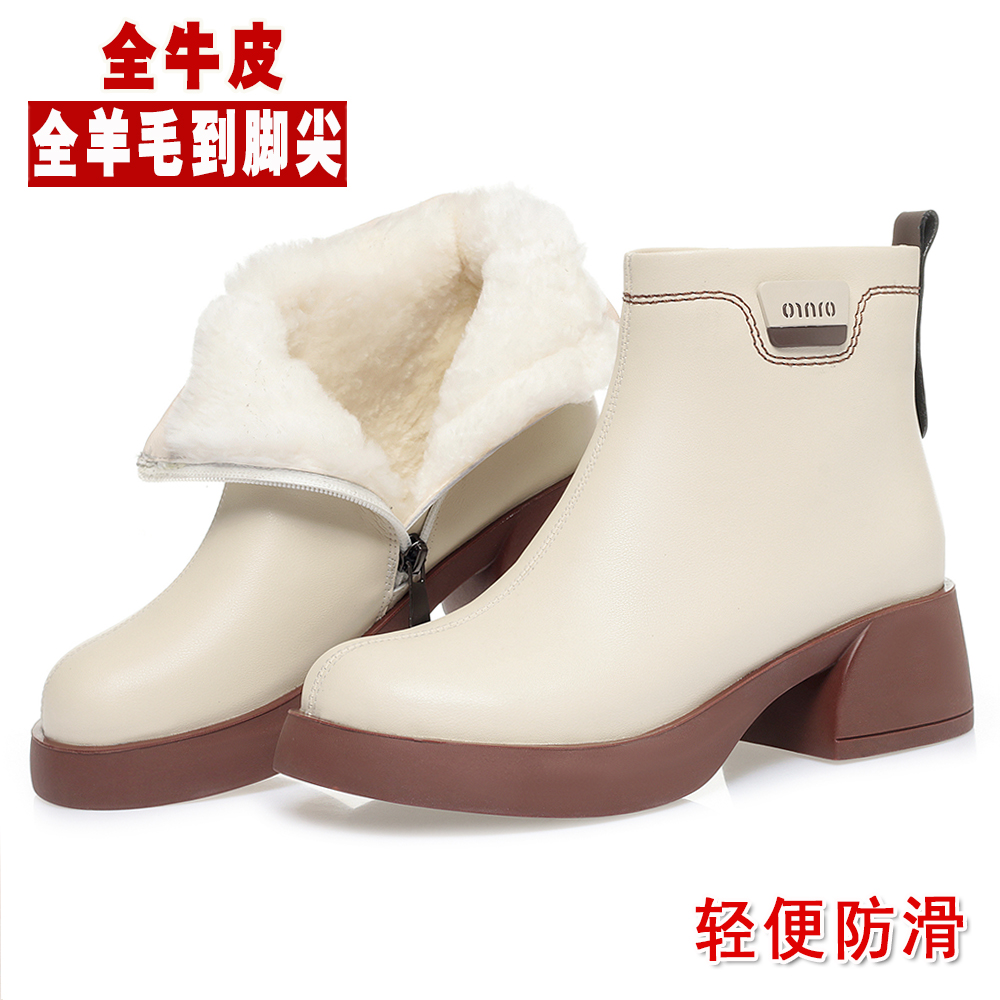 厚底女士真皮羊毛皮鞋 妈妈棉鞋 秋冬加绒女鞋 白色靴子高跟短靴女款