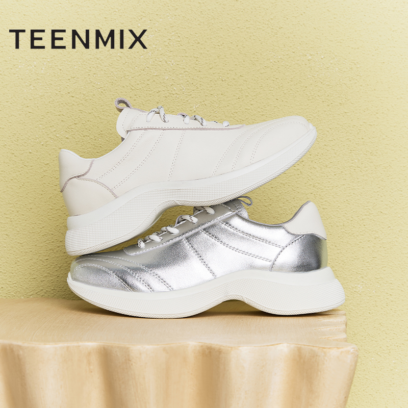 新款 天美意厚底老爹鞋 春季 女小白系带休闲鞋 BK481AM5 银色运动鞋