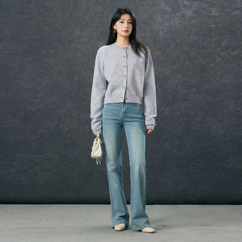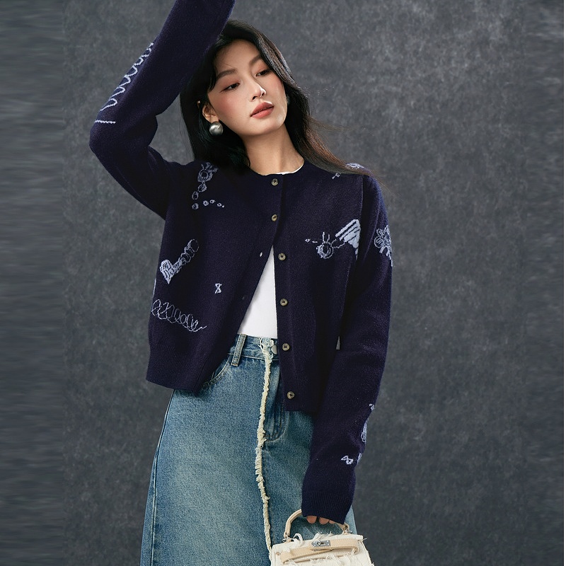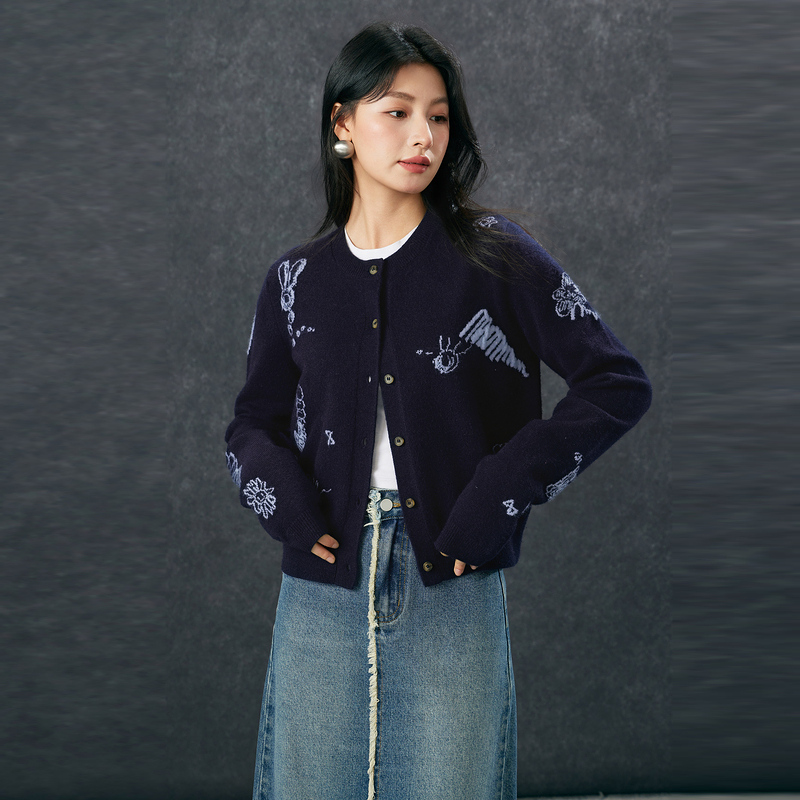 House 针织衫 百家好卡通刺绣开衫 绵羊毛圆领长袖 女 外套秋季 Basic