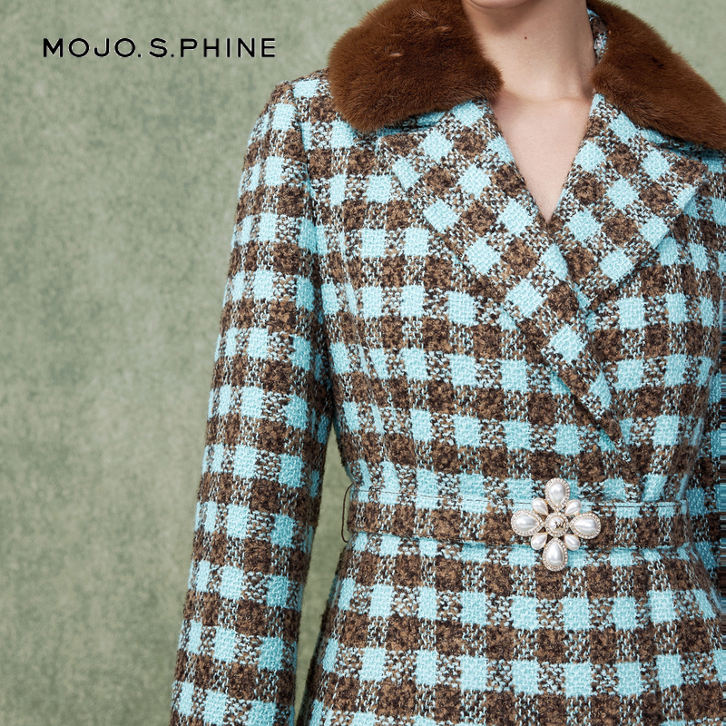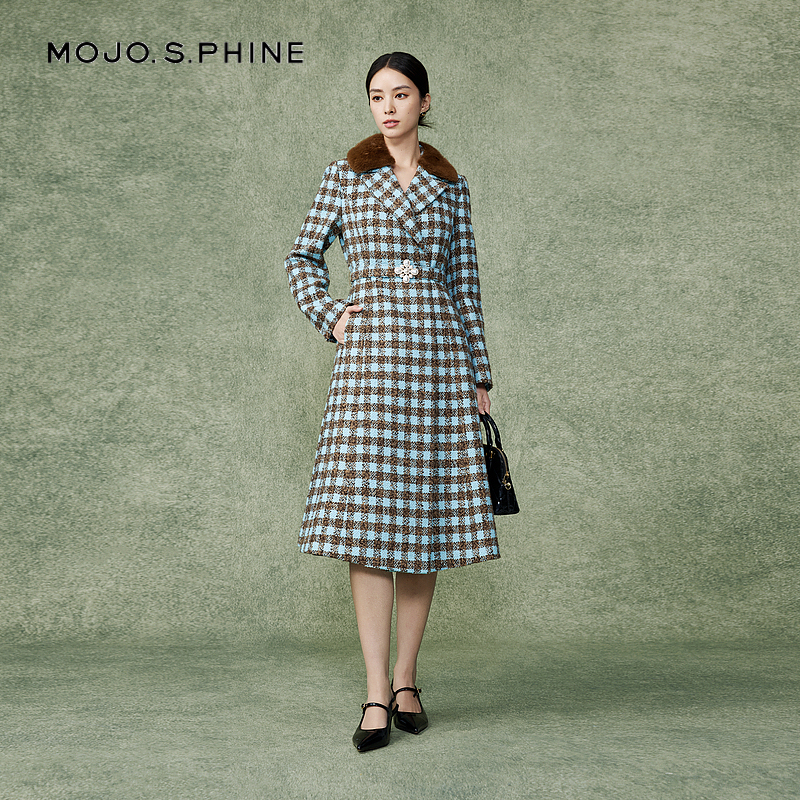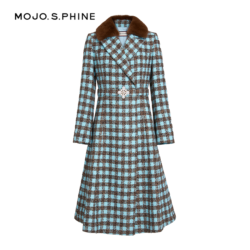 带毛领气质毛呢外套女 时尚 MOJO莫佐摩登格子长款 大衣2024秋冬新款