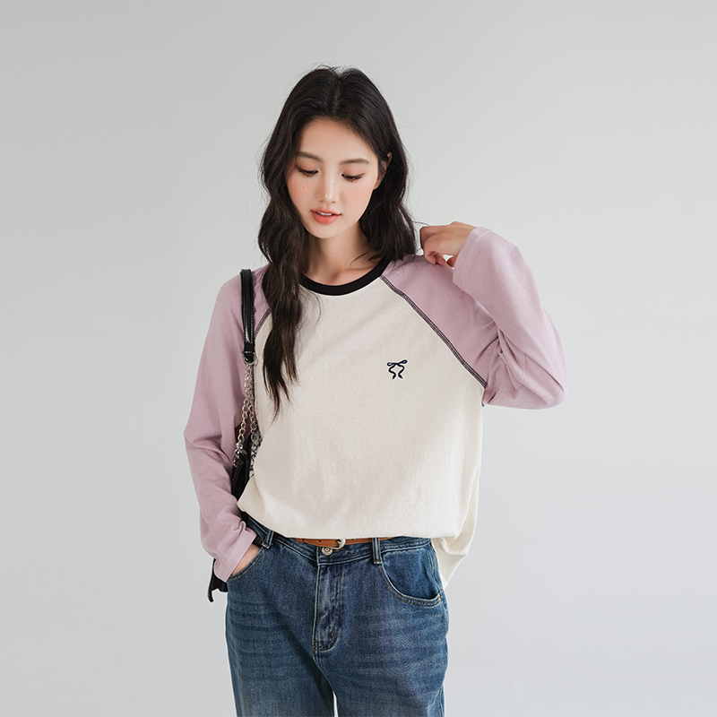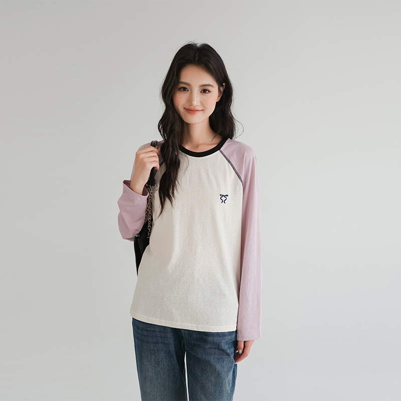 新款 蓝若水大码 T恤胖mm秋季 别致插肩长袖 宽松刺绣打底上衣 女装