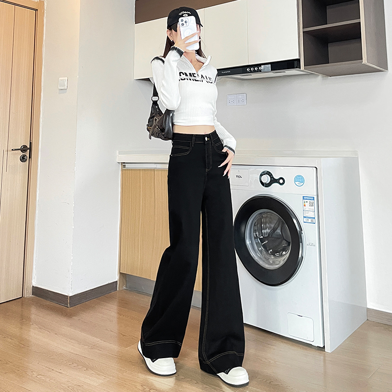 子 女高腰2025春秋深蓝色丹宁直筒裤 Jessica郑秀妍同款 阔腿牛仔裤