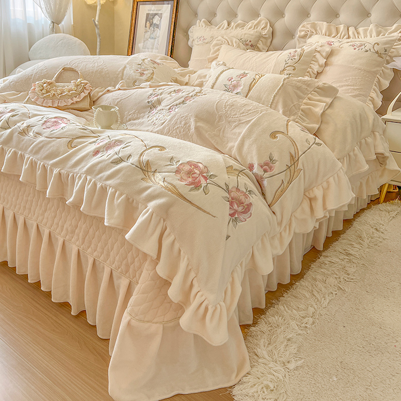 高端奢华刺绣A类牛奶绒四件套夹棉床盖款 公主风荷叶花边被套冬季