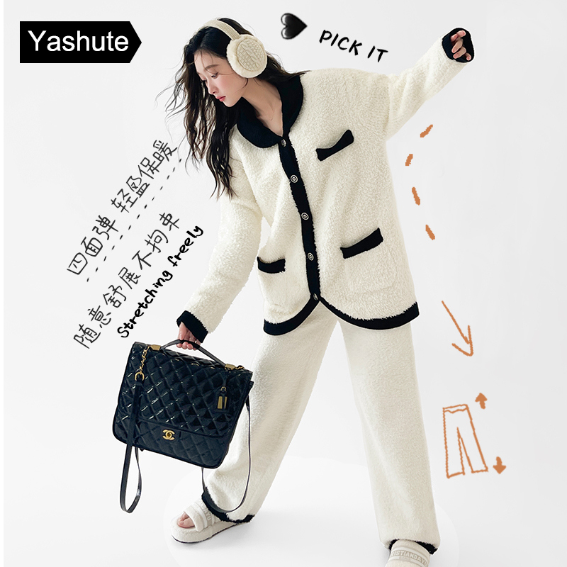 睡衣女冬季 小香风时髦可外穿保暖冬家居服 松弛感半边绒睡衣套装