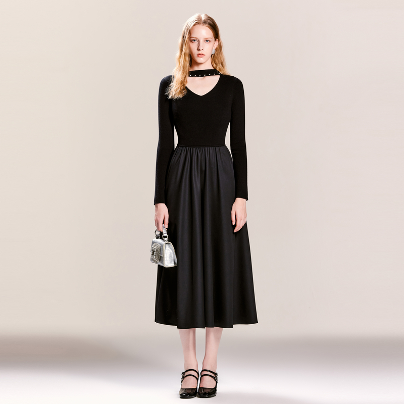 赫本风法式 太平鸟长袖 修身 中长款 船领收腰褶皱连衣裙女25春新款