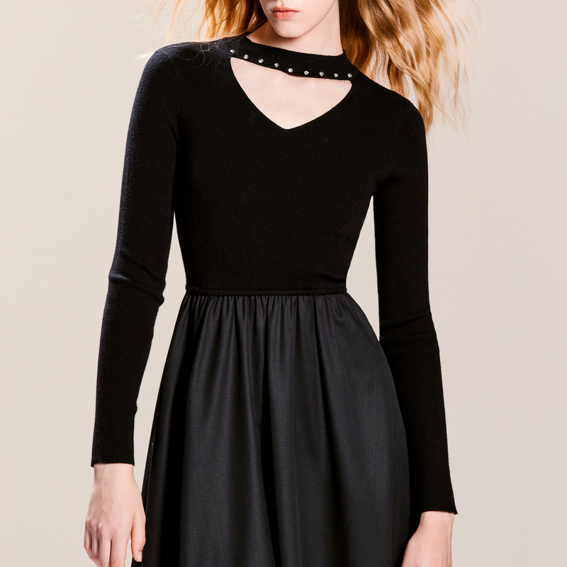 MOCO连衣裙春夏小香风雕花银扣渐变坑条肌理高腰针织黑色摩安珂