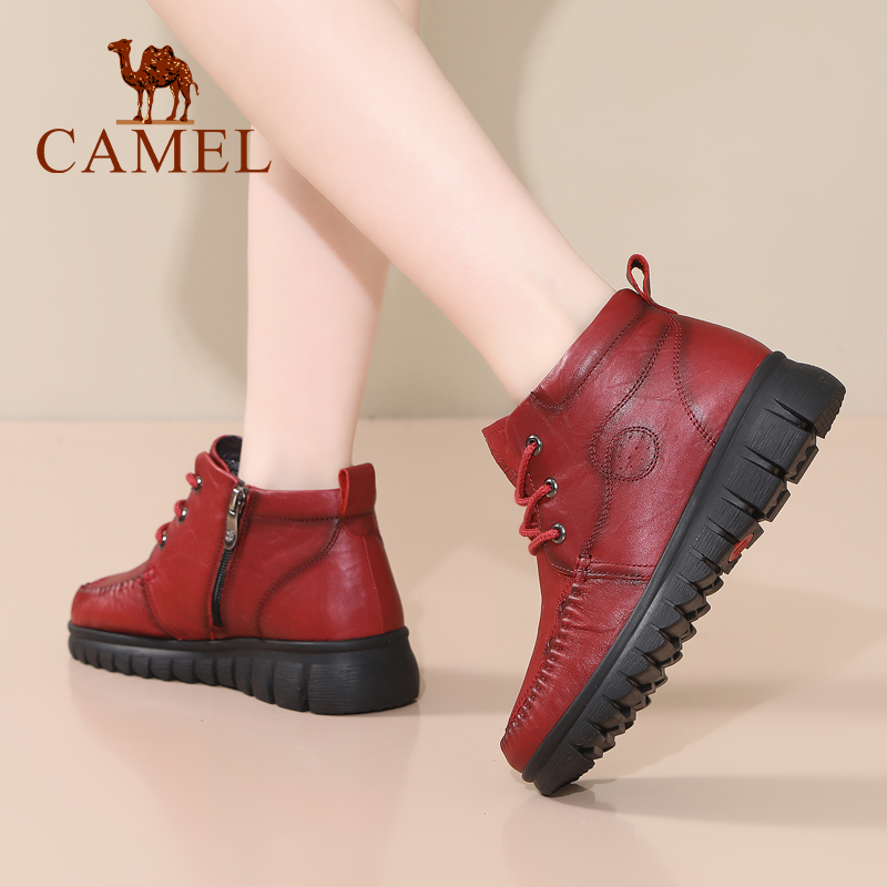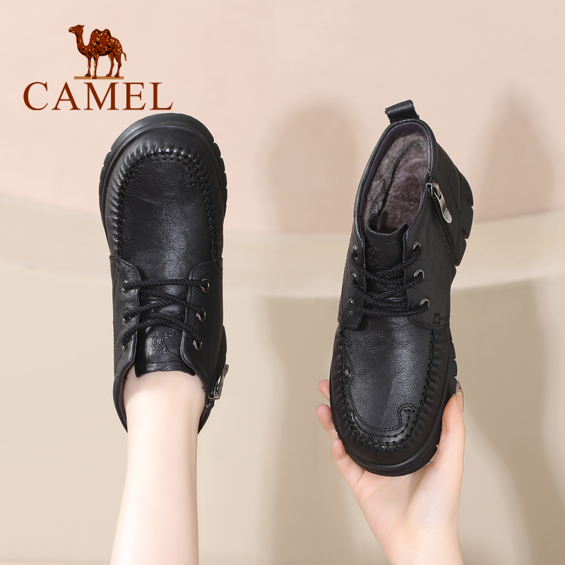 真皮羊毛加绒保暖女靴高帮舒适休闲妈妈短靴 新款 骆驼女鞋 25冬季