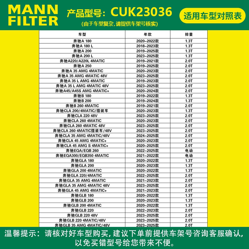 GLA 曼牌活性炭空调滤芯CUK23036适用奔驰A EQB CLA GLB级