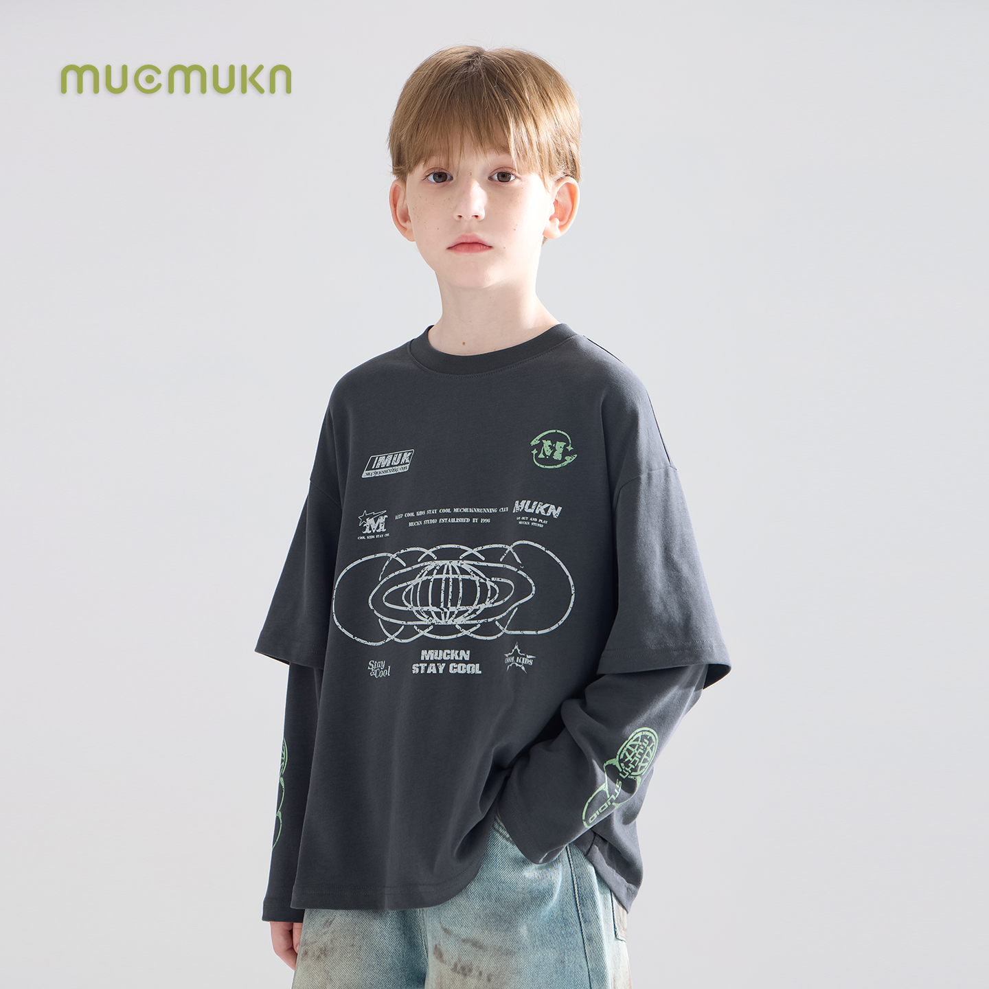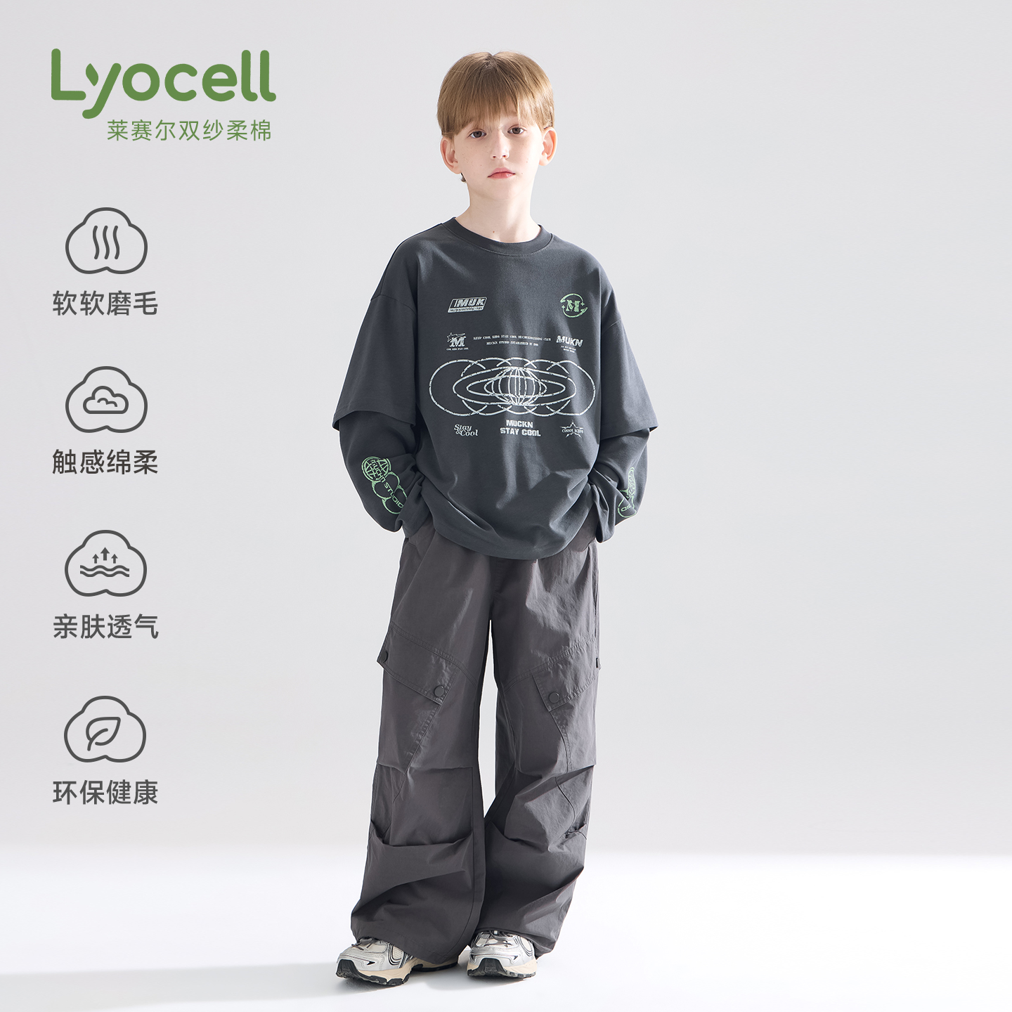 机能感印花假两件T恤长袖 磨毛莱赛尔柔棉 男童秋新款 赛博机车