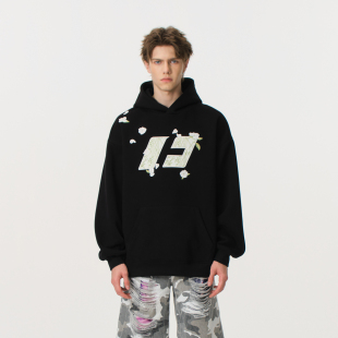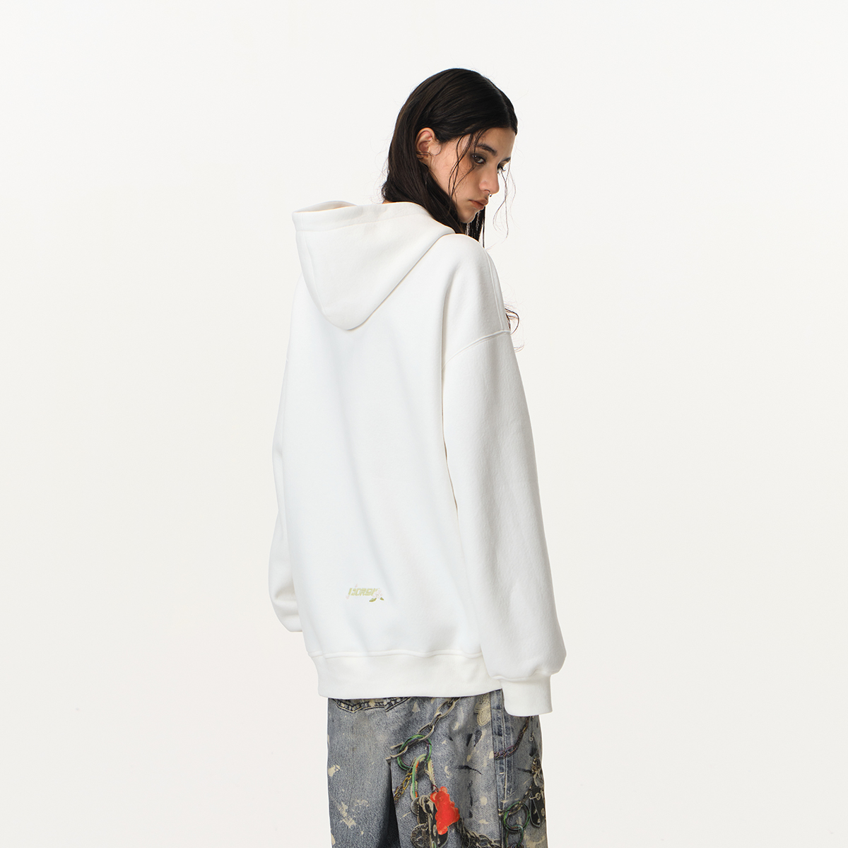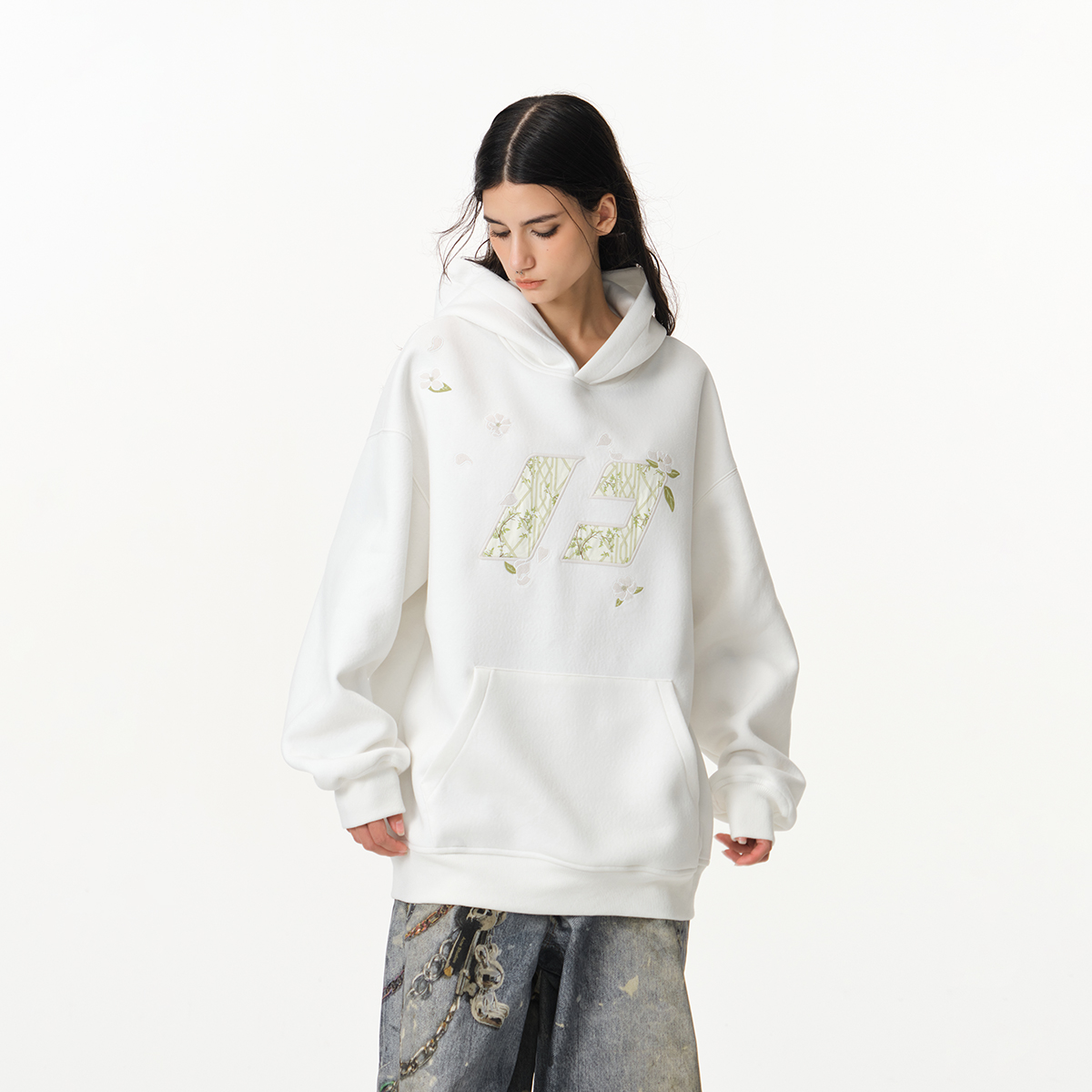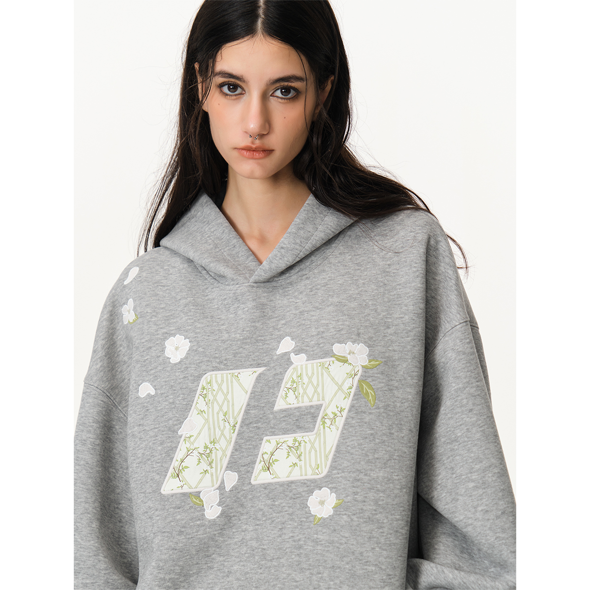 FORNINES国潮花伴竹重磅刺绣灰色卫衣男女情侣加绒外套休闲连帽衫