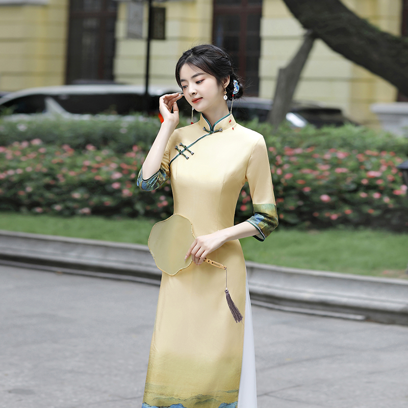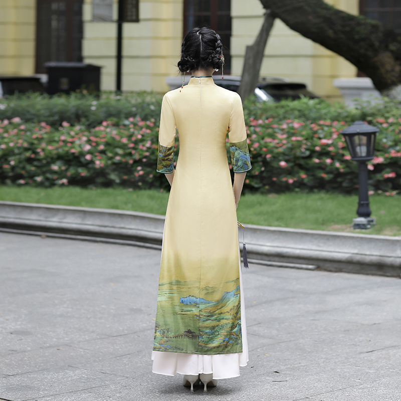千百思千里江山图奥黛旗袍中国风改良2025新款 高端走秀演出服长款