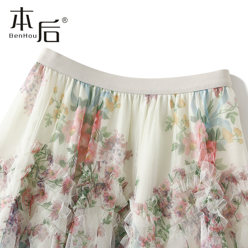 气质长裙a字裙 法式 8077 不规则彩色花朵碎花网纱半身裙春秋女新款