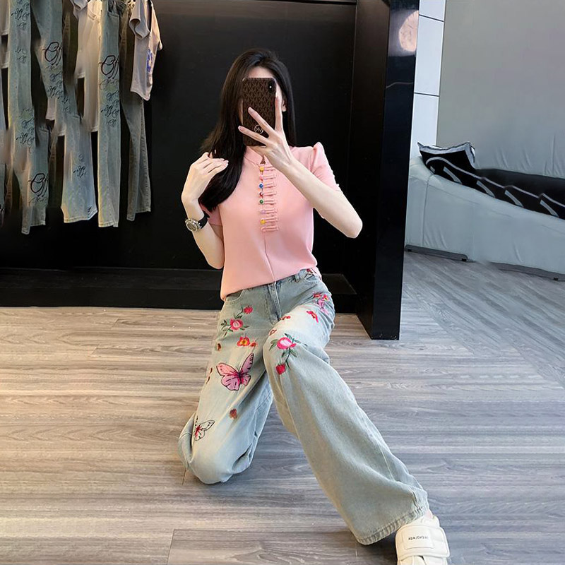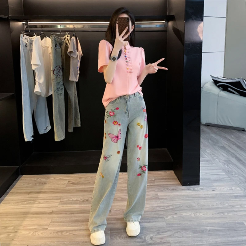 百搭拖地阔腿长裤 女春夏休闲时尚 直筒牛仔裤 蝴蝶花朵高腰显瘦窄版