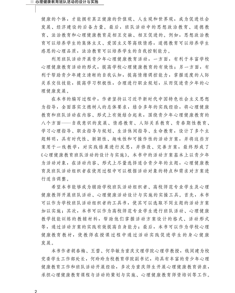 设计与实施 胡春梅 王蕾 情感教育人际关系教育学习心理指导 心理健康教育班队活动 青少年心理健康教育 北京师范大学 2022.8月