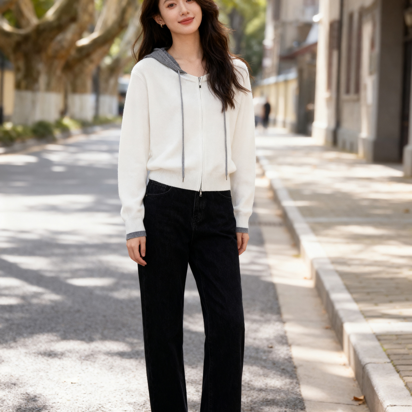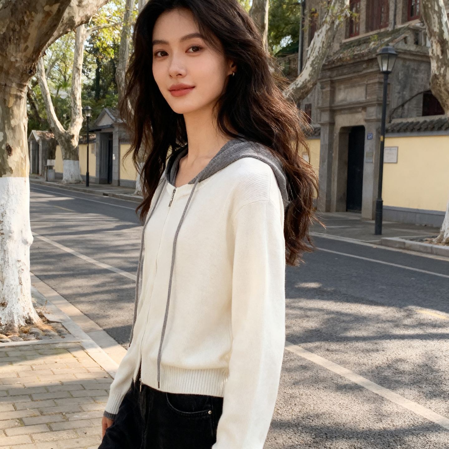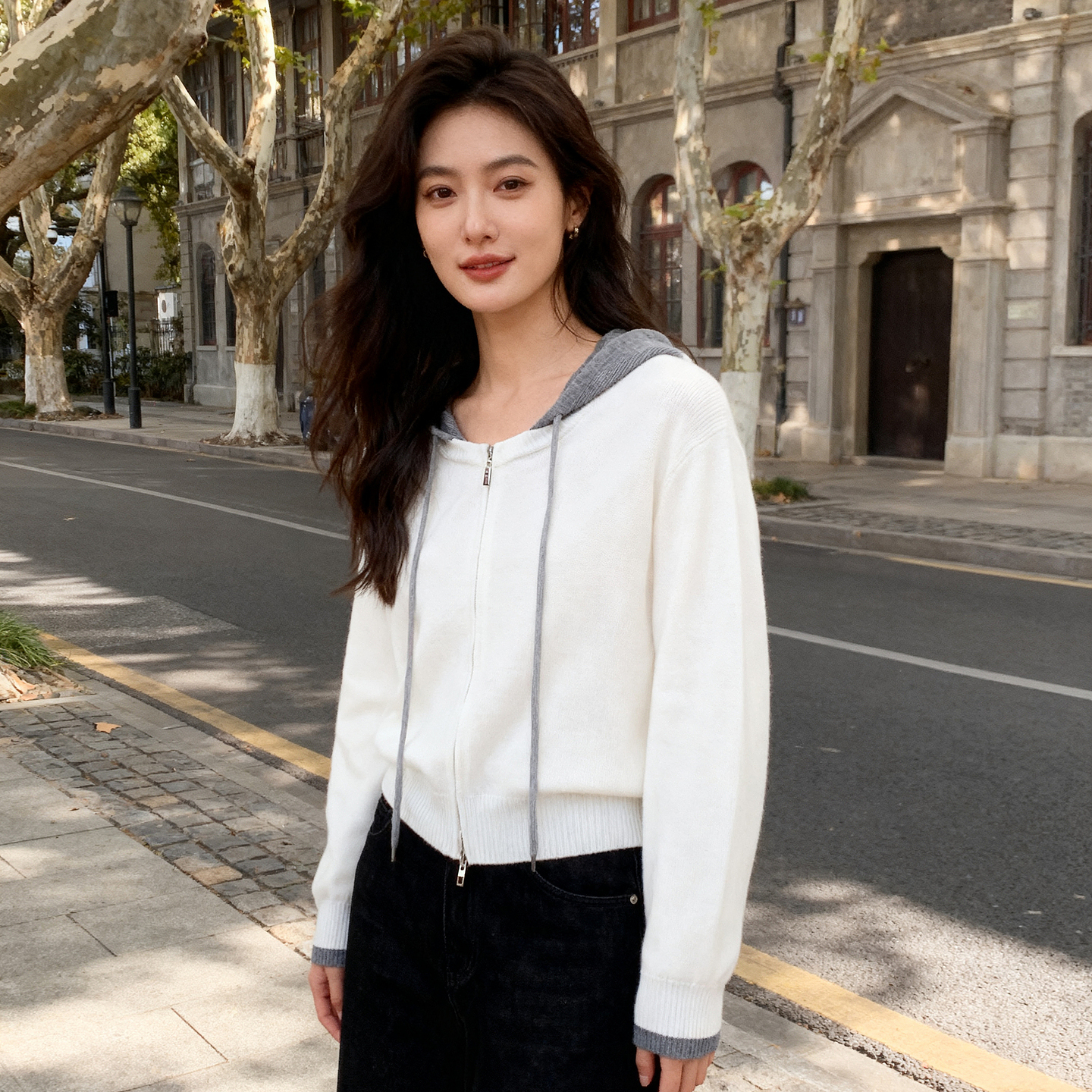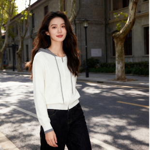 女秋季 百家好莱赛尔撞色连帽开衫 双拉链宽松针织上衣 House Basic