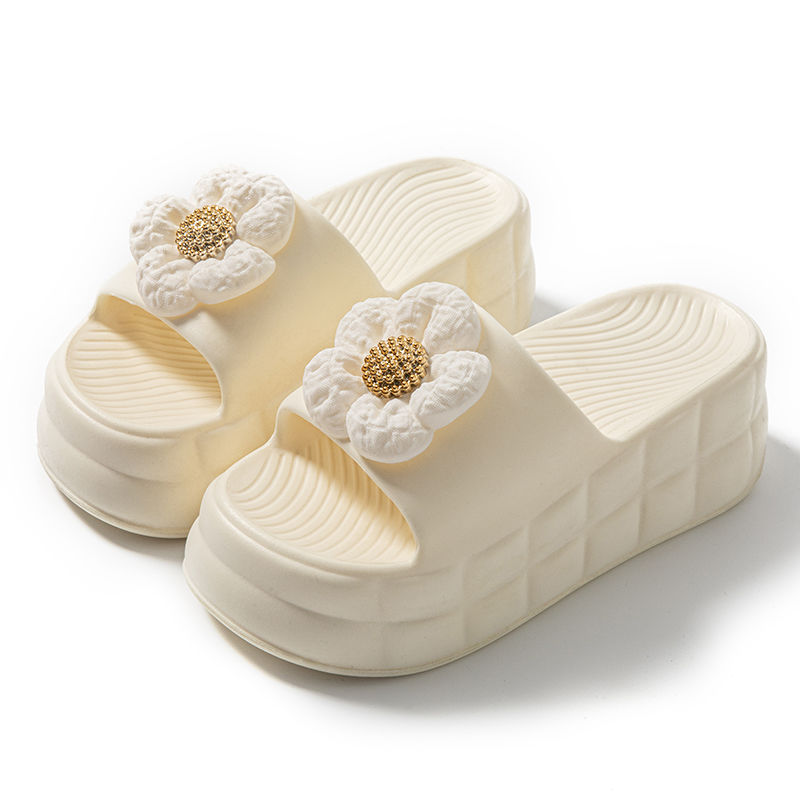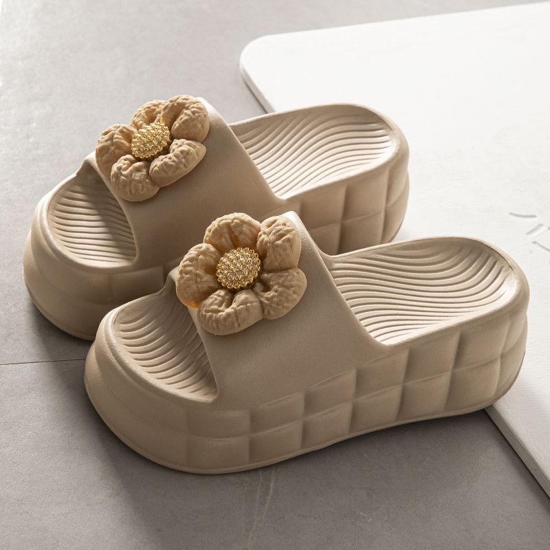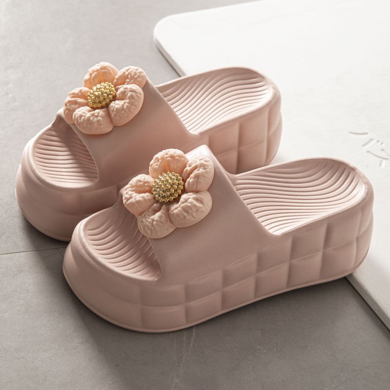 踩屎感厚底高跟一字拖鞋 外穿甜美百搭花朵增高防滑耐磨凉拖 女夏季