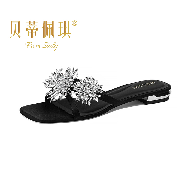 水钻花朵低跟凉拖鞋 新款 女2025年夏季 高级感方头露趾平跟外穿拖鞋