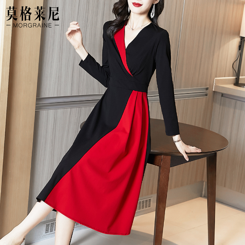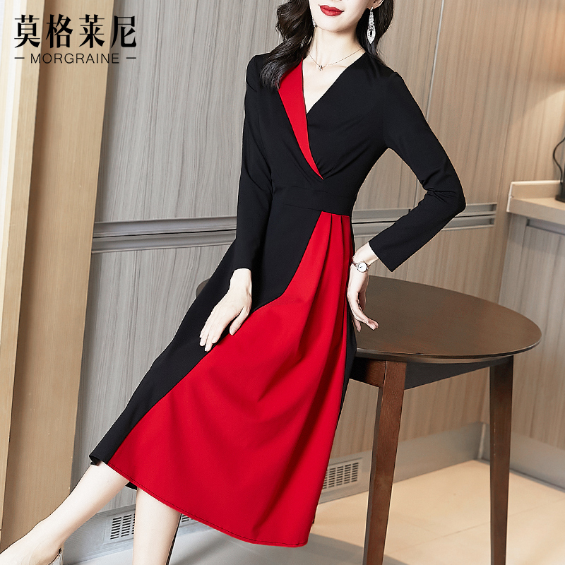 中长款 高端优雅轻熟气质修身 裙子 新款 菲梦伊钉珠红色连衣裙女秋装