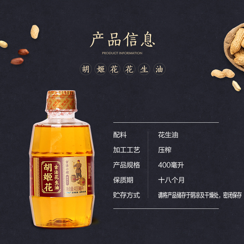 传统工艺 食用油 压榨健康家用 古法小榨花生油400ml瓶 胡姬花