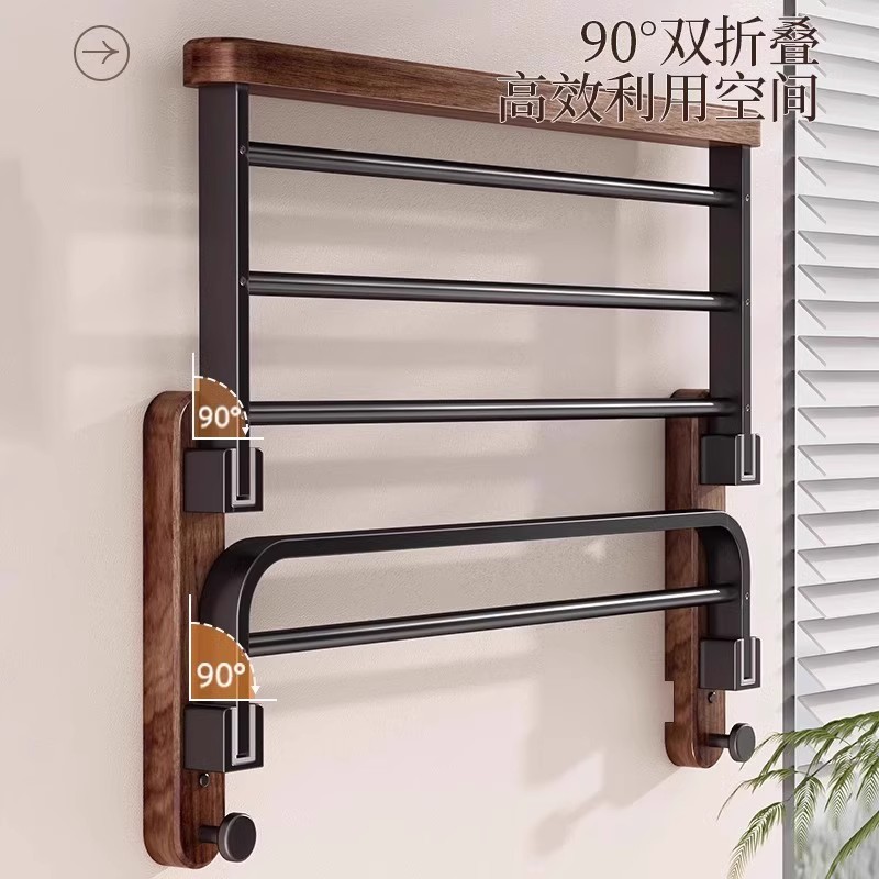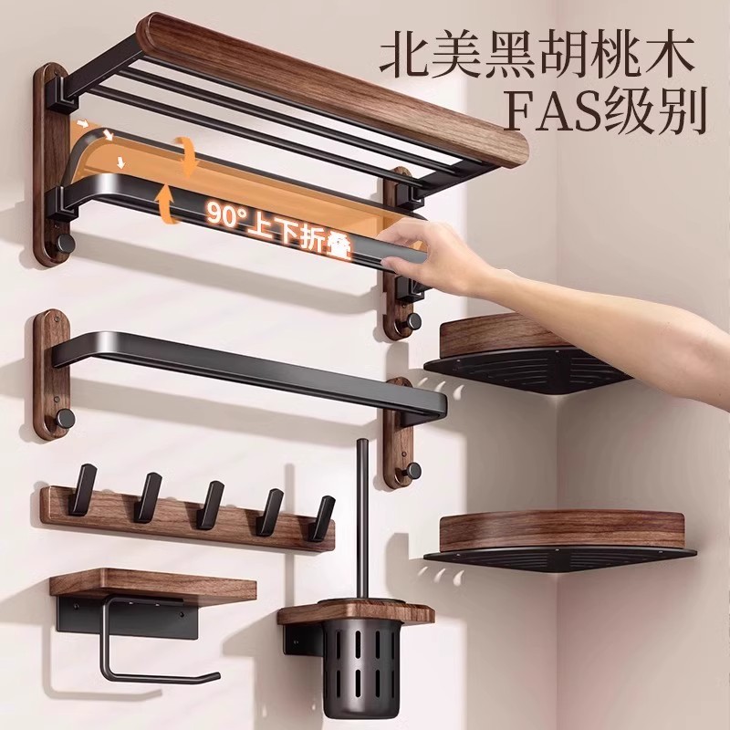 美拉黑胡桃木毛巾架卫生间免打孔浴室浴巾置物架高端卫浴架子收纳