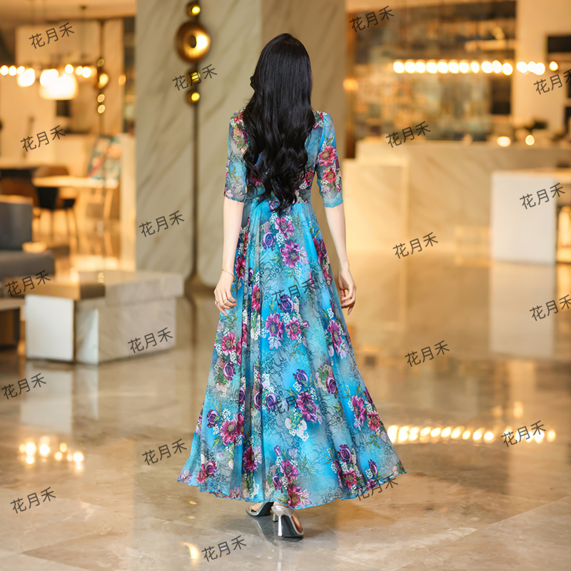 扭结连衣裙气质优雅长裙宴会礼裙 复古V领长袖 韩语琳 法式