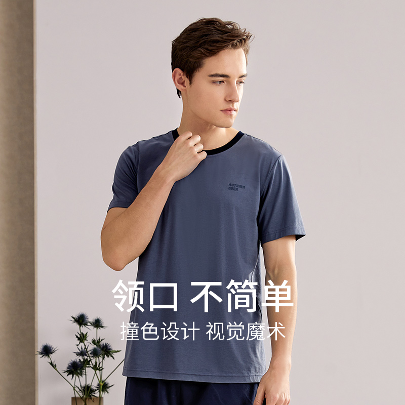 纯色薄款 秋鹿长绒棉夏天睡衣男款 纯棉家居服男春夏套装 五分裤 短袖