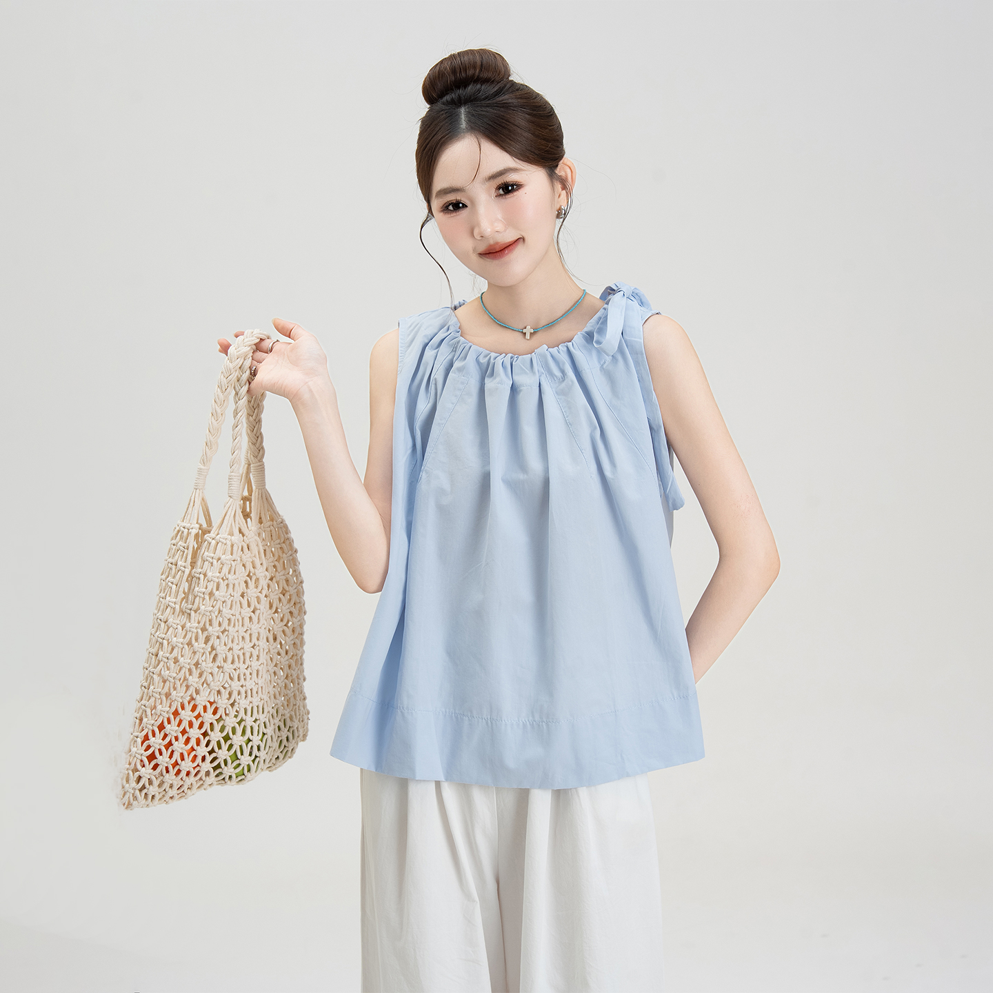新款 蓝色法式 女夏季 衬衫 蝴蝶结绑带褶皱宽松显瘦背心上衣 甜美无袖