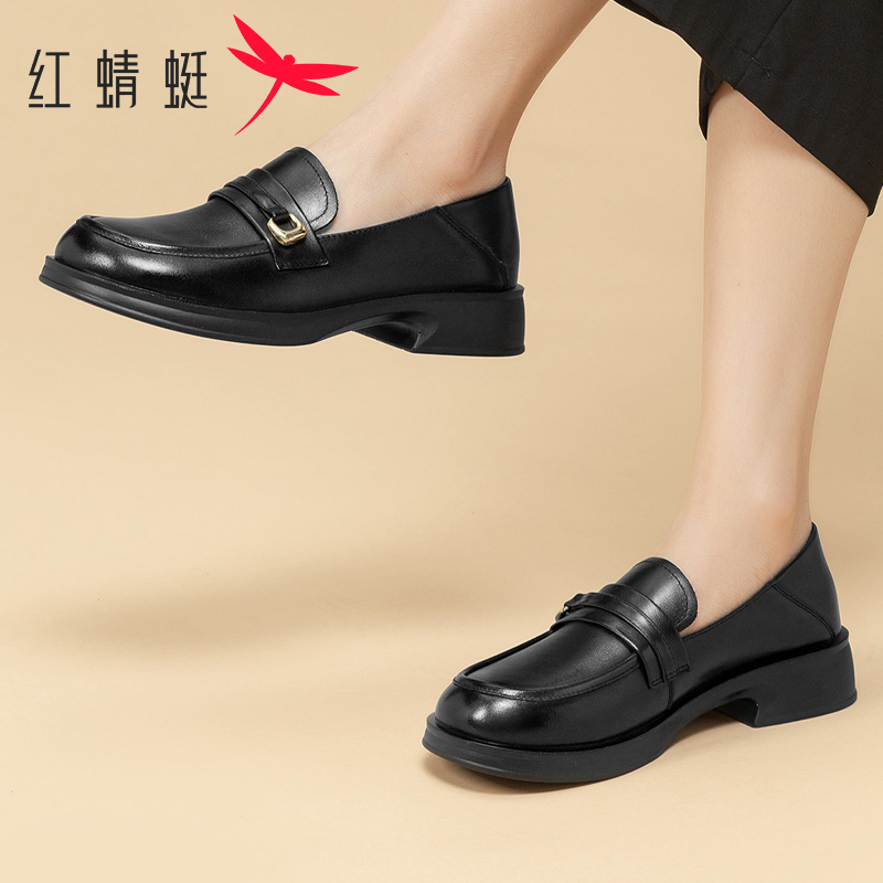 女2025夏季 一脚蹬中跟女鞋 新款 软皮单鞋 真皮英伦皮鞋 红蜻蜓乐福鞋
