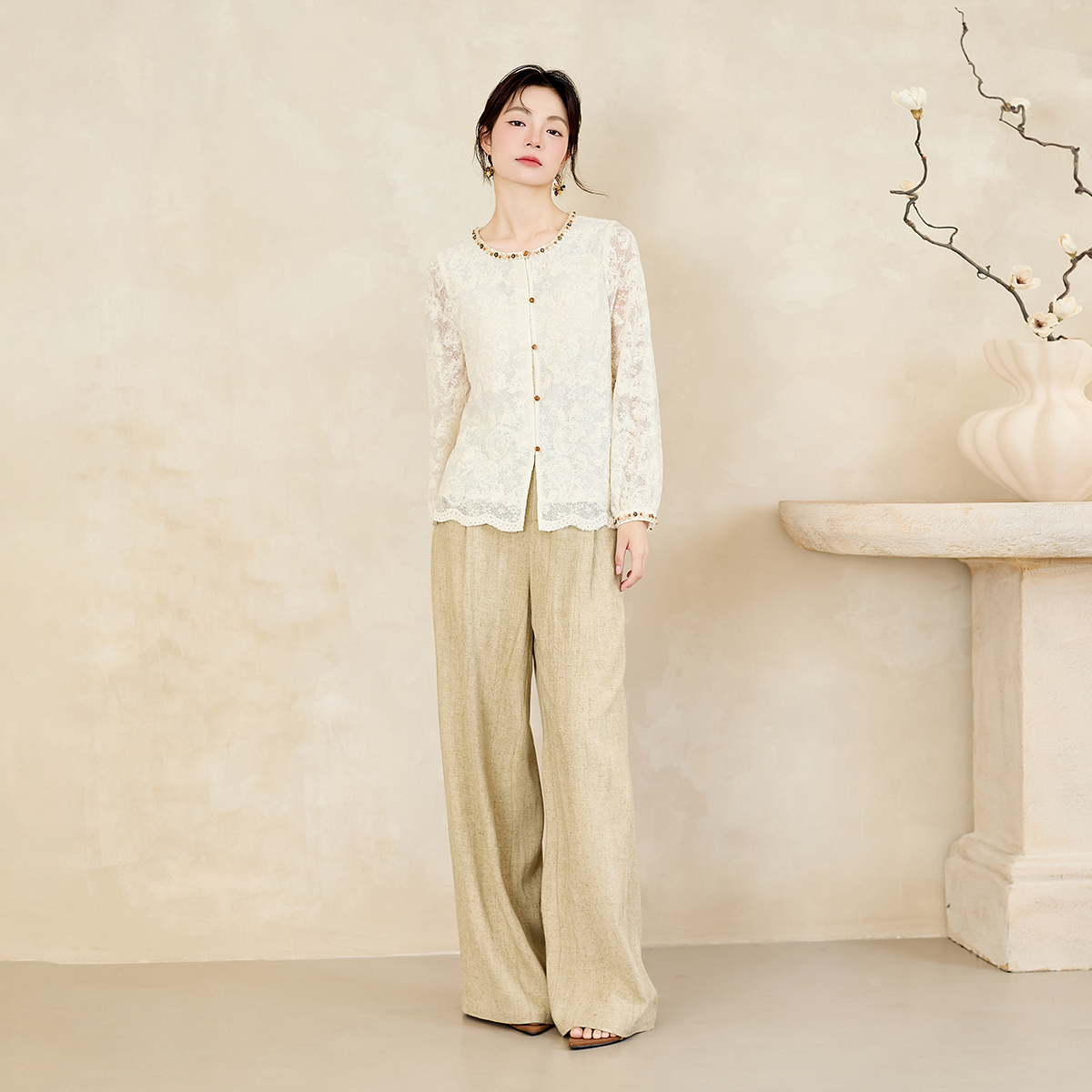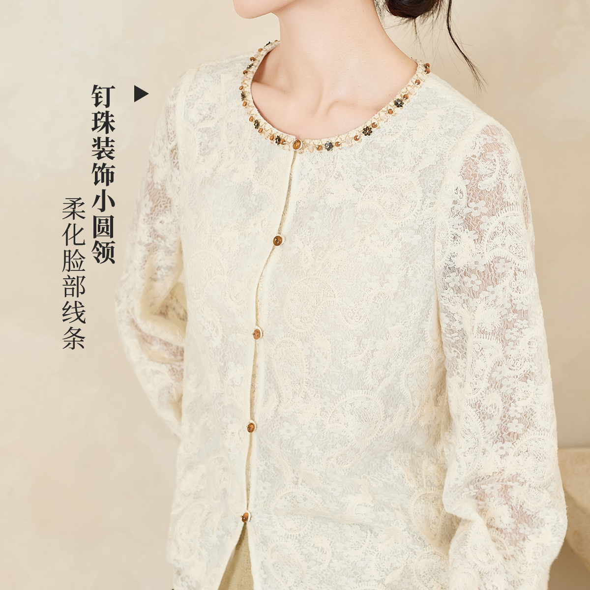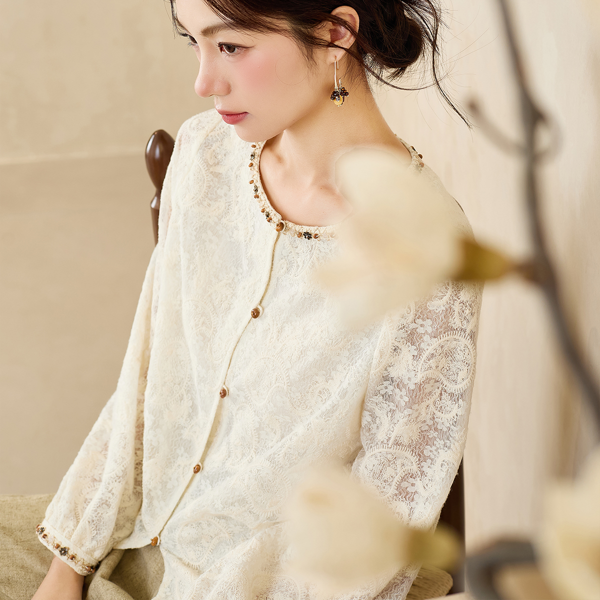 上衣 钉珠边波西米亚风小衫 秸熙2025春秋新品 重工刺绣蕾丝白色衬衫