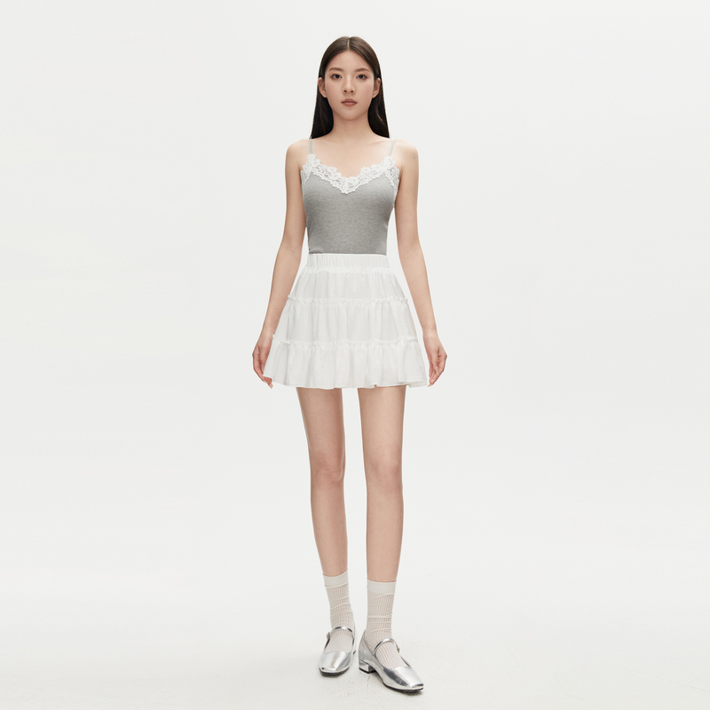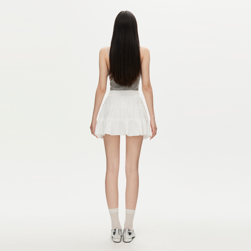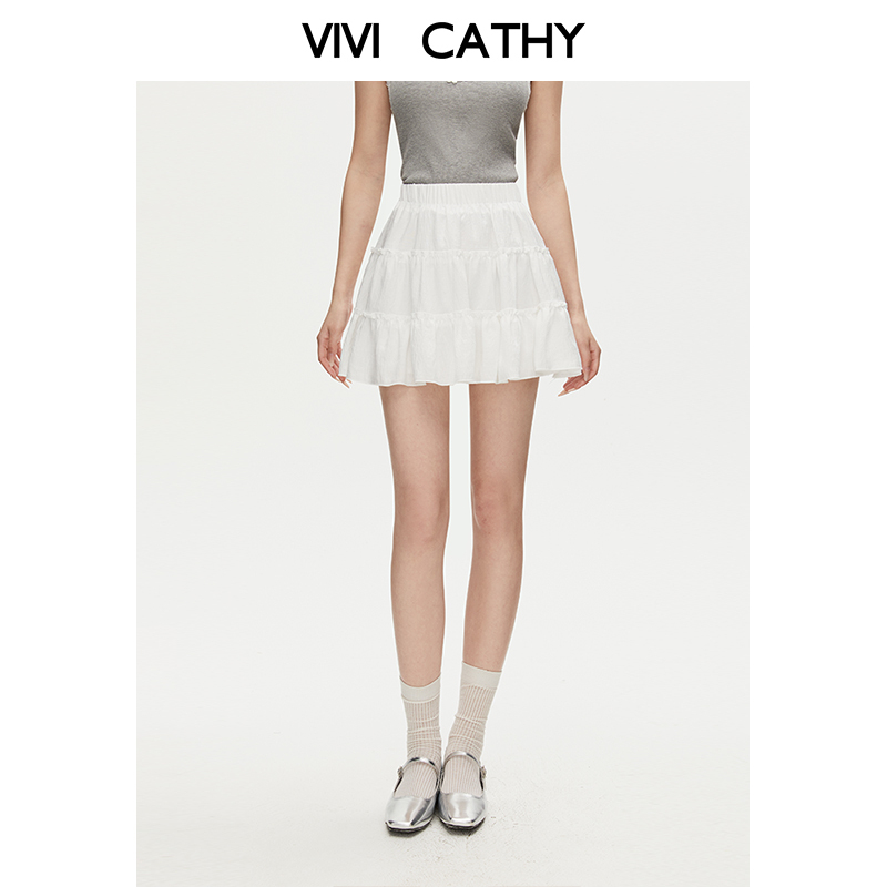 VIVICATHY2025夏芭蕾风白色蛋糕短裙女高腰显瘦木耳边A字半身裙