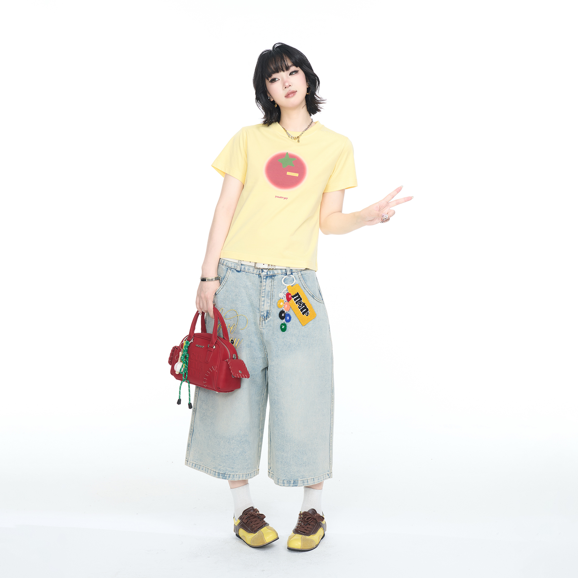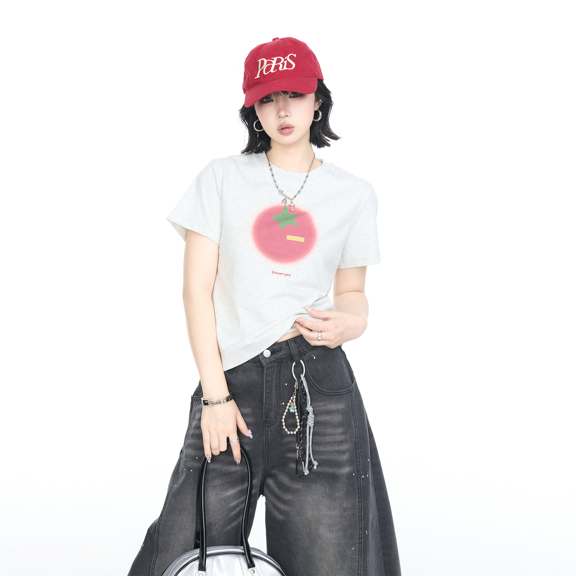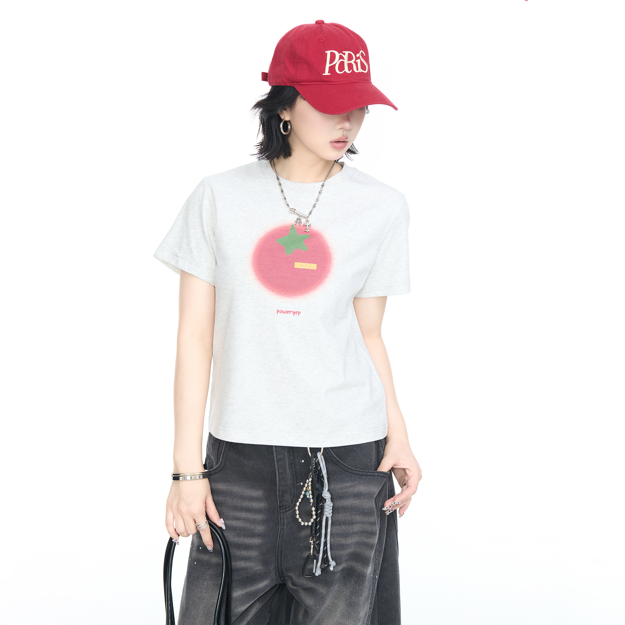 正肩卡通印花T恤女甜辣风显瘦休闲半袖 2025夏季 短款 修身 上衣 新款