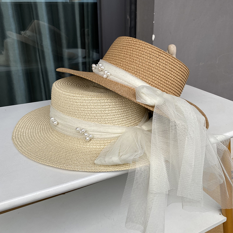 法式 蕾丝珍珠平顶帽海边沙滩旅游度假防晒遮阳帽 小香风草帽女夏季