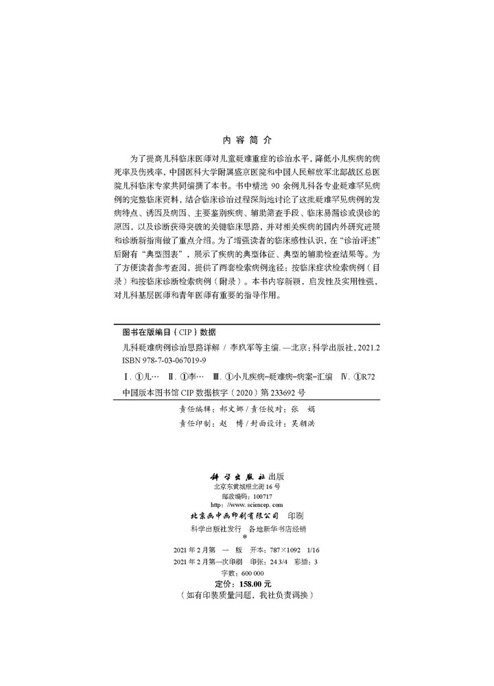 完整临床资料 李玖军 毛健等主编 正版 科学出版 精选90余例儿科各专业疑难罕见病例 9787030670199 社 儿科疑难病例诊治思路详解