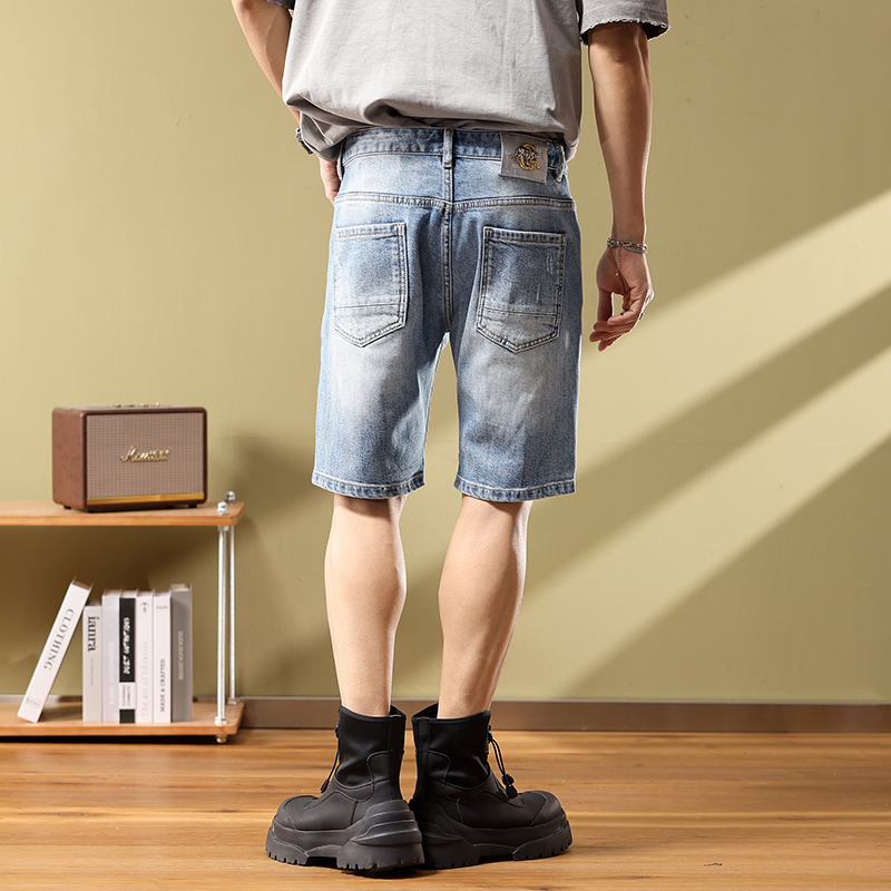 男修身 牛仔短裤 小脚五分裤 潮牌5分中裤 浅蓝破洞 夏季 休闲马裤 薄款