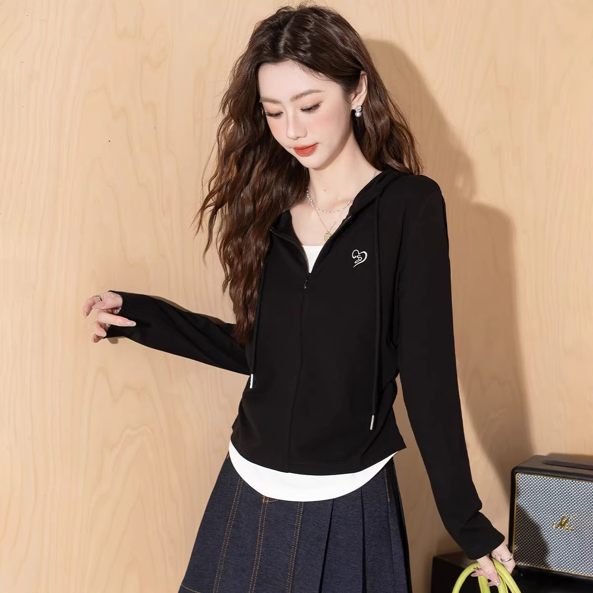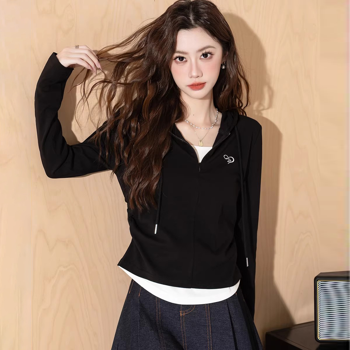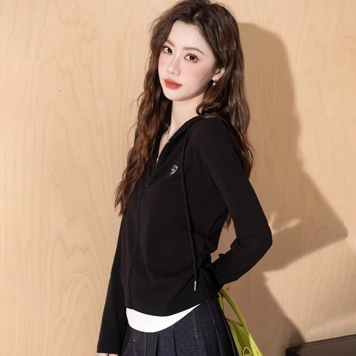 班尼路春秋褶皱松紧高弹修身 T恤女刺绣休闲上衣女J 假两件连帽长袖