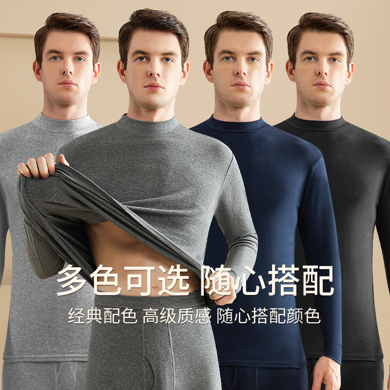 薄款 浪莎纯棉秋衣秋裤 中领全棉毛衫 套装 保暖内衣半高领中老年 男士