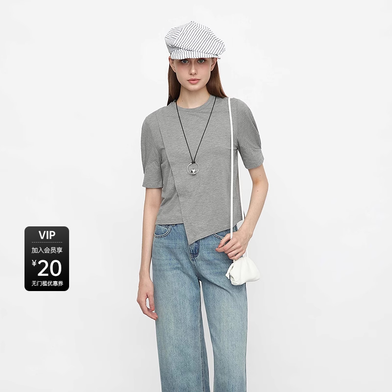 设计感T恤S24280109 圆领拼接不规则泡泡袖 sdeer圣迪奥夏装 女装