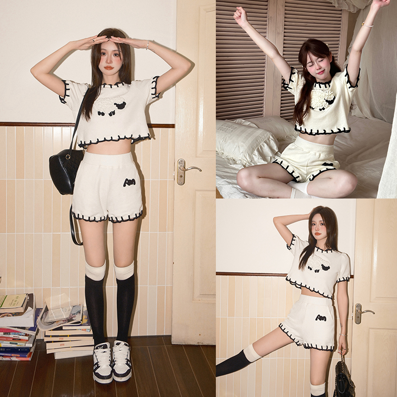 休闲套装 ANDREA 短裤 秋白色小羊撞色贡针肌理短袖 MARTIN