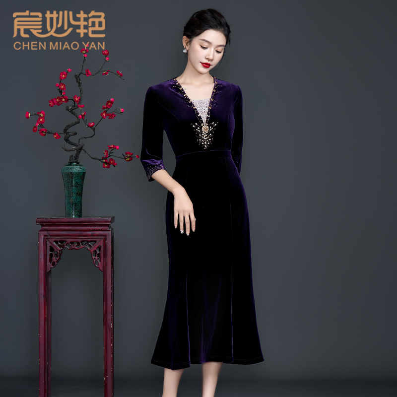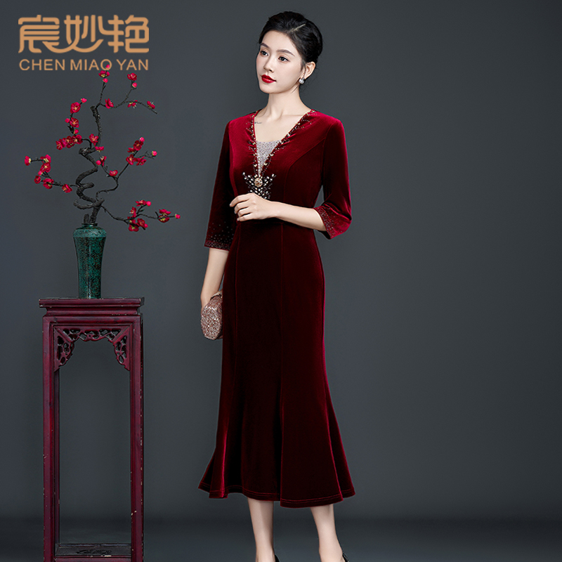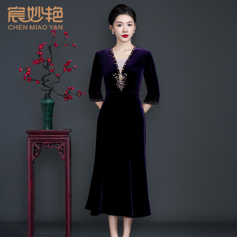 金丝绒连衣裙女妈妈婚宴礼服 气质长款 宸妙艳喜婆婆婚宴装 新款