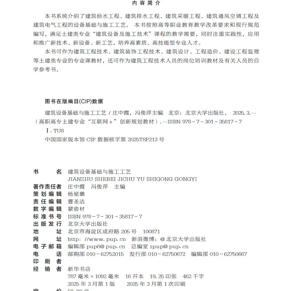 创新规划教材 庄中霞 冯俊萍 建筑设备基础与施工工艺 社 互联网 北京大学出版 9787301358177 高职高专土建专业