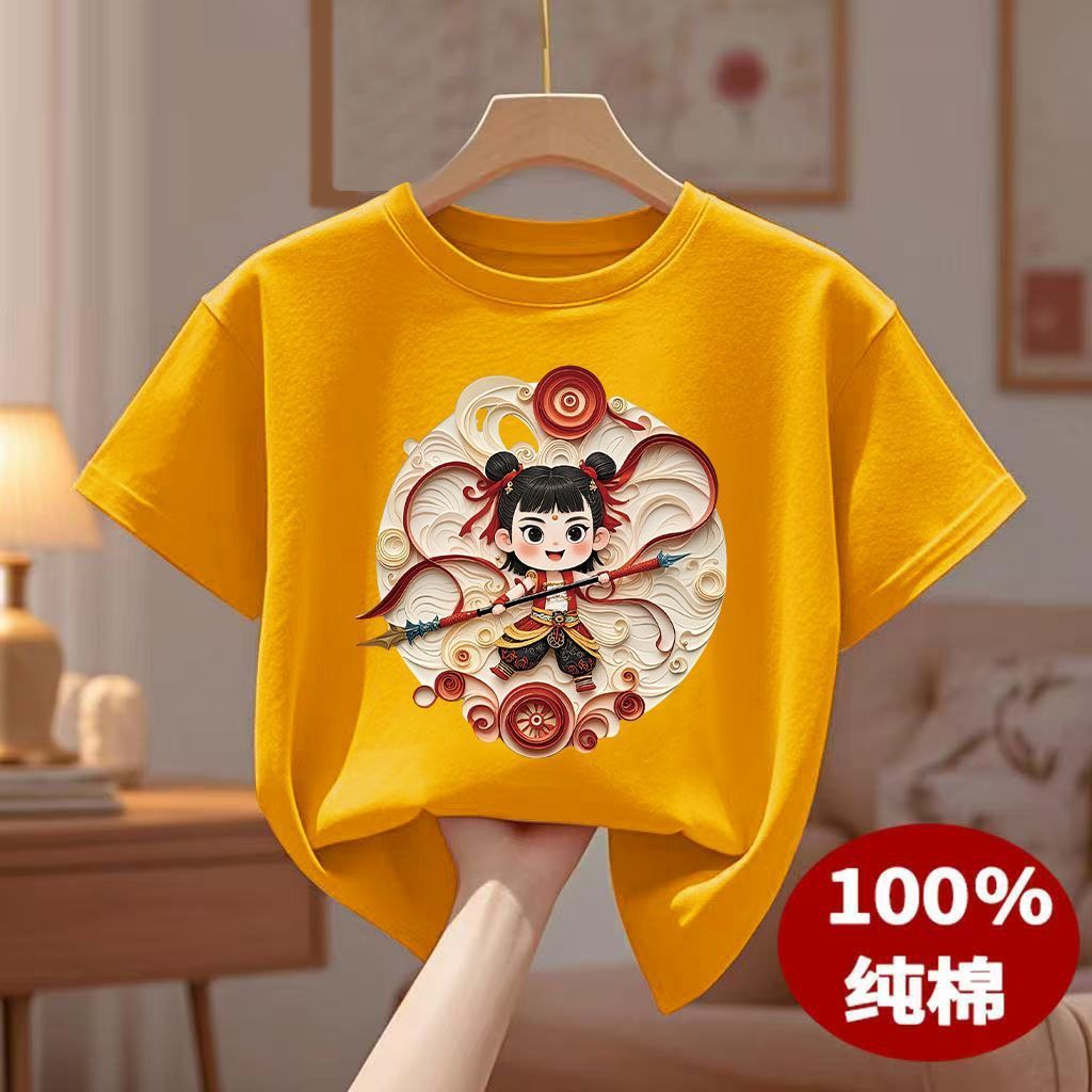 男女童圆领上衣中大童国潮衣服t 爆款 哪吒儿童纯棉短袖 T恤2025夏季