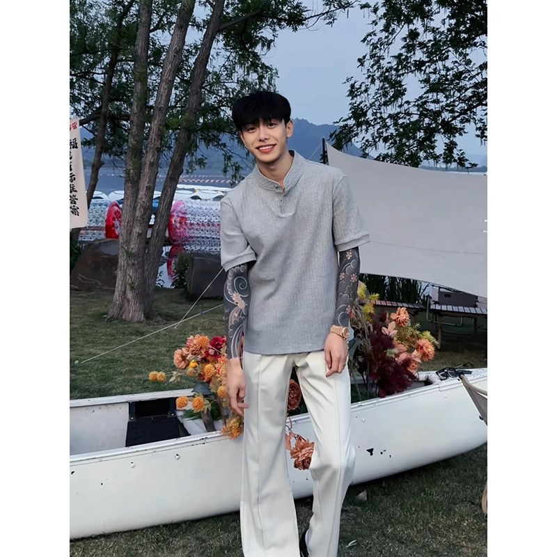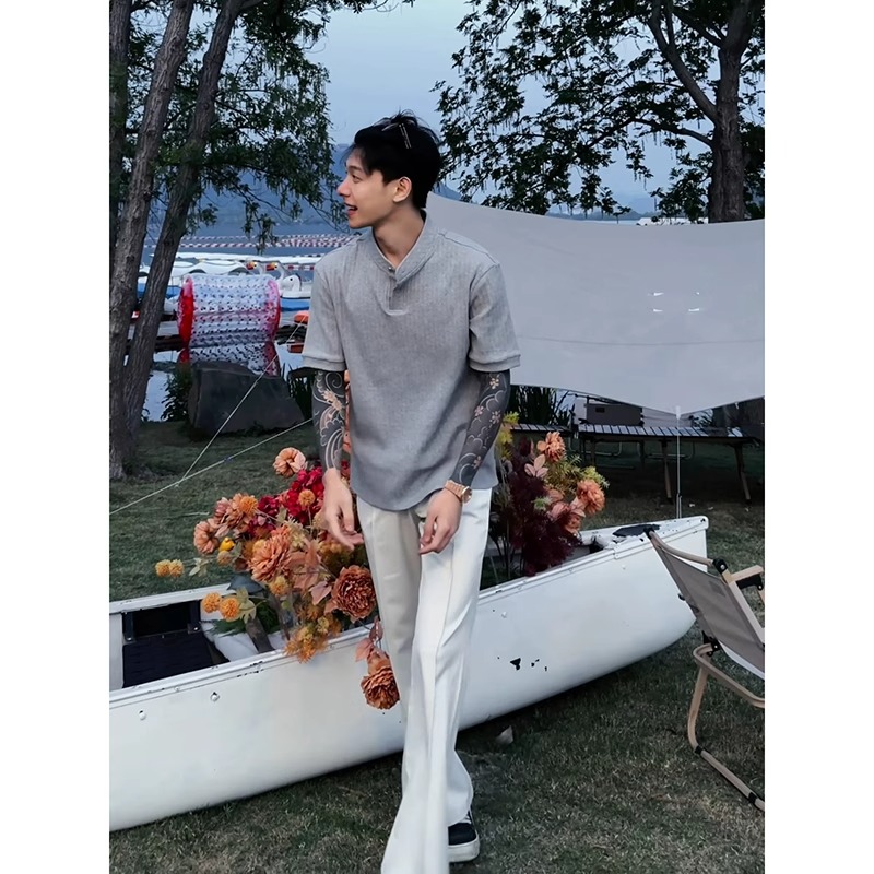 夏季 男款 老钱风肌理感t恤重磅美式 修身 亨利领针织短袖 半袖 polo衫